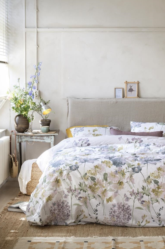 De verfijnde bloemenprint en zachte kleuren zorgen voor een elegante en rustgevende sfeer in de slaapkamer.