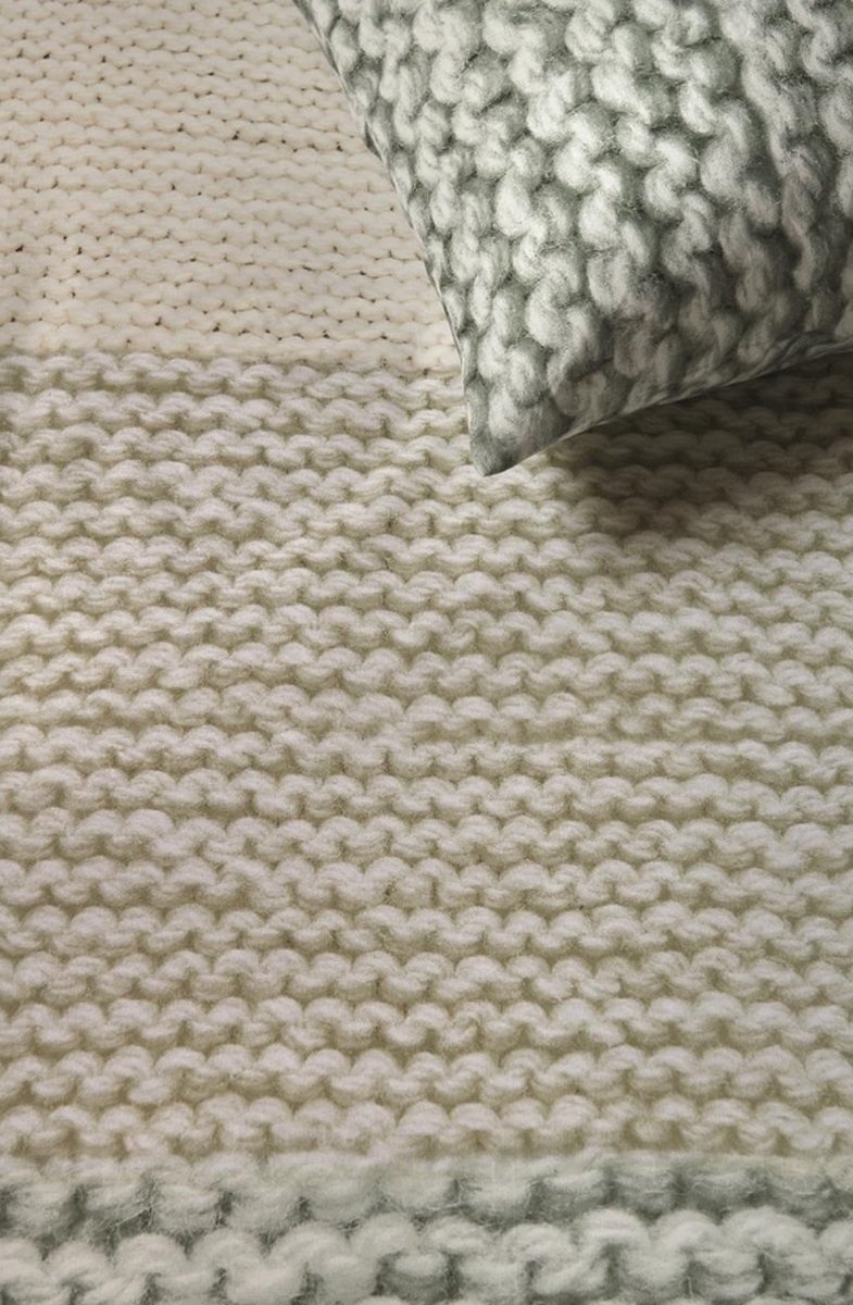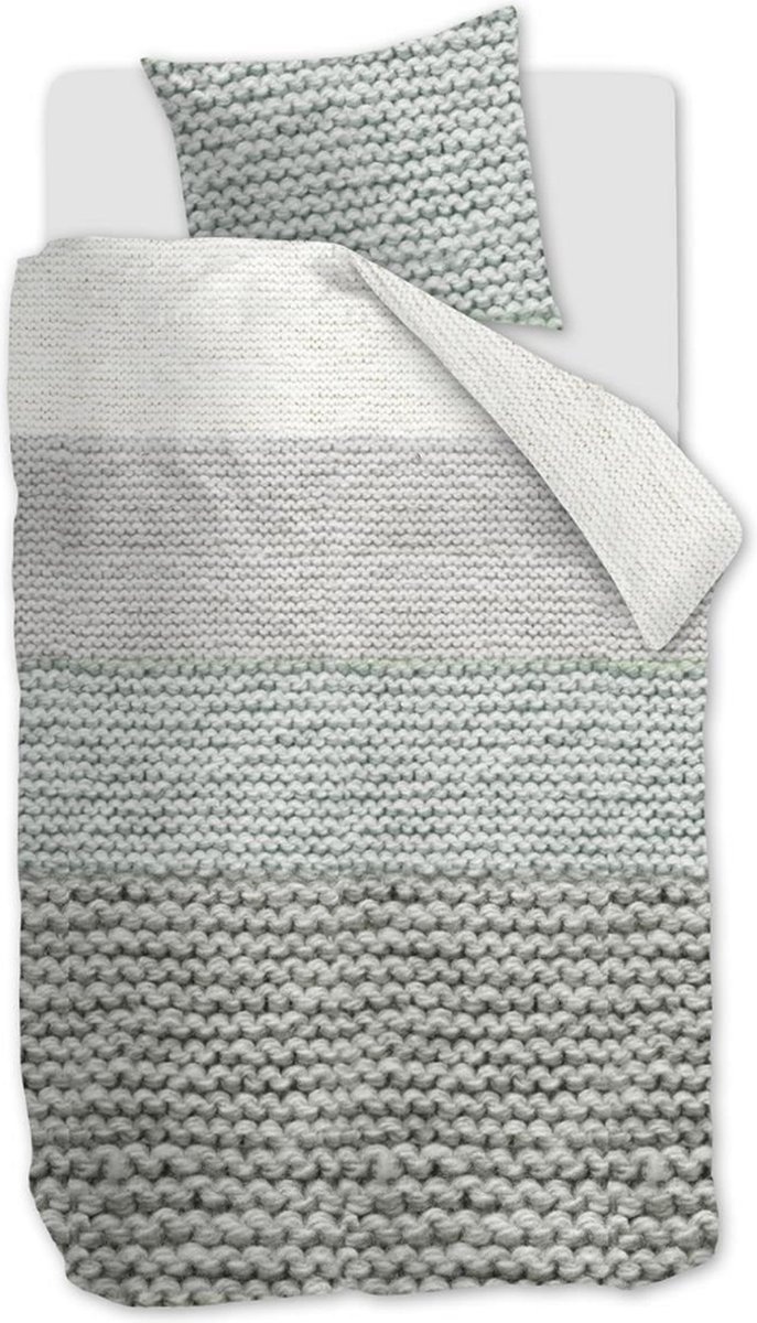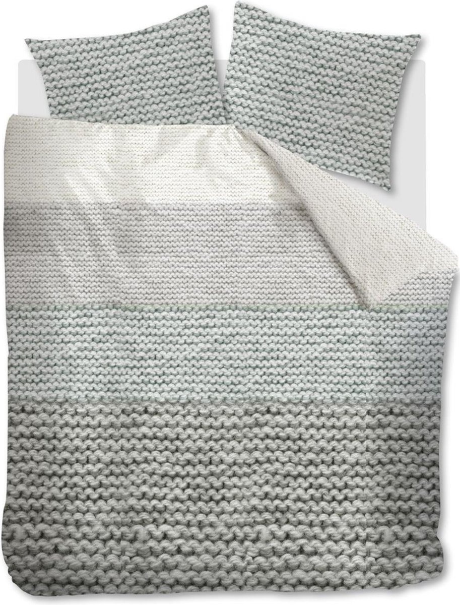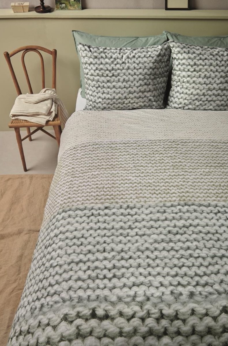Dit dekbedovertrek heeft een opvallend dessin dat oogt als een grof gebreide structuur met verschillende banen en subtiele kleurvlakken. Zachte tinten groen, lichtgrijs en naturel wisselen elkaar af en geven het geheel een warme, huiselijke uitstraling met een duidelijk textielkarakter.