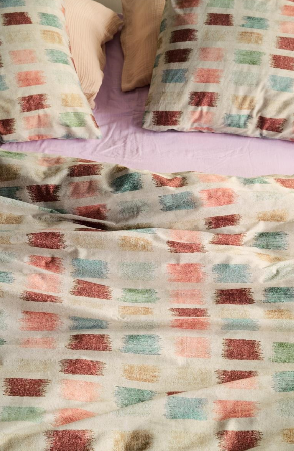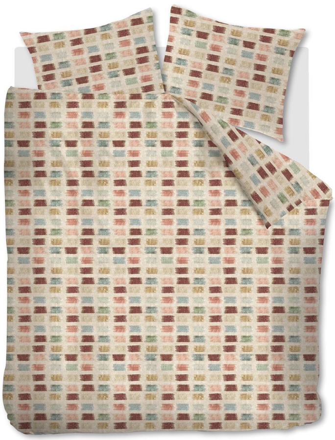 Het At Home Area Multi dekbedovertrek brengt een speelse en moderne uitstraling naar de slaapkamer met een verfijnd grafisch blokkenpatroon in zachte, warme tinten. De combinatie van beige, rood, groen en blauw zorgt voor een harmonieus geheel dat rust uitstraalt en tegelijkertijd karakter toevoegt aan het interieur. Dit ontwerp past perfect binnen een eigentijdse woonstijl en sluit naadloos aan bij een stijlvol beige dekbedovertrek.