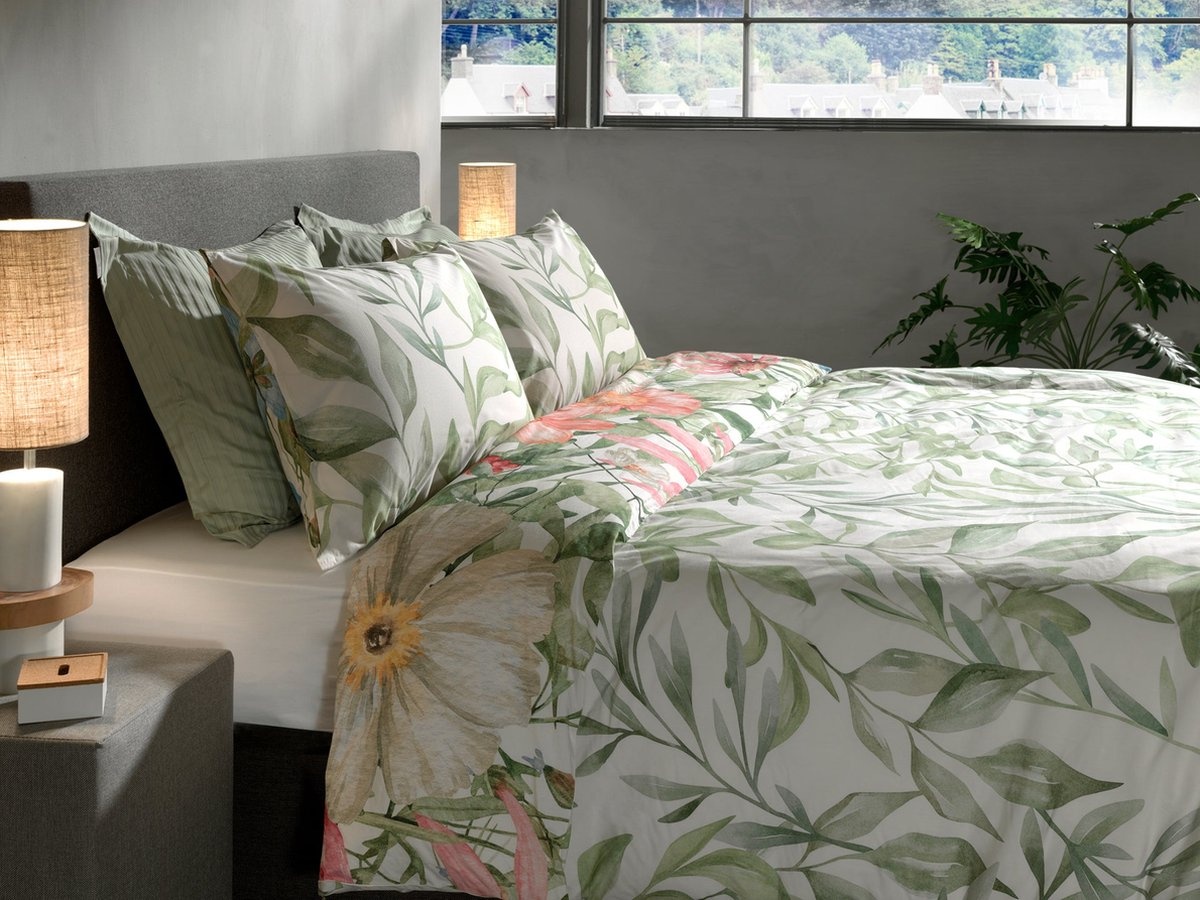 Het dekbedovertrek is vervaardigd uit 50% bamboevezels en 50% percale katoen. Percale katoen heeft een dichte weefstructuur, wat zorgt voor stevigheid en een zacht oppervlak. Het materiaal staat bekend om zijn ademende en vocht absorberende eigenschappen en waarborgt hiermee een droge en comfortabele nachtrust. percale katoen is duurzaam, vormt niet snel pluisjes en behoudt zijn zachte gevoel, zelfs na talloze wasbeurten.