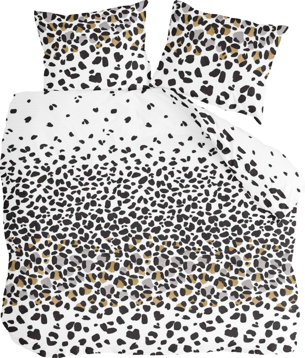 Dit eigentijdse dekbedovertrek heeft een speels patroon van onregelmatige vlekken in zwart, grijs en subtiele goudtinten op een frisse witte ondergrond. Het dessin heeft een moderne, bijna abstracte uitstraling die doet denken aan een stijlvolle dierenprint met een grafisch karakter.