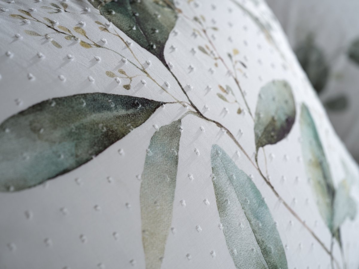 - Het katoen is geweven met een clip sheared techniek, hierdoor is een patroon van textielbolletjes te zien