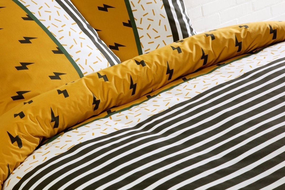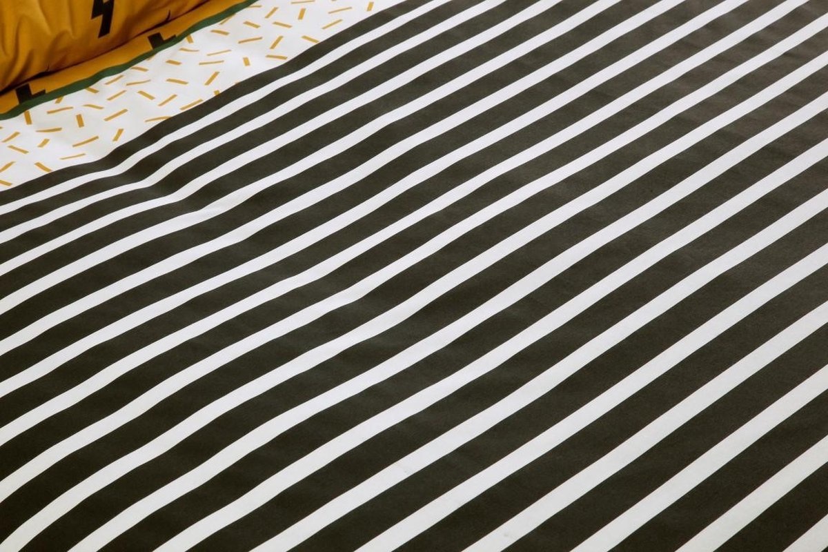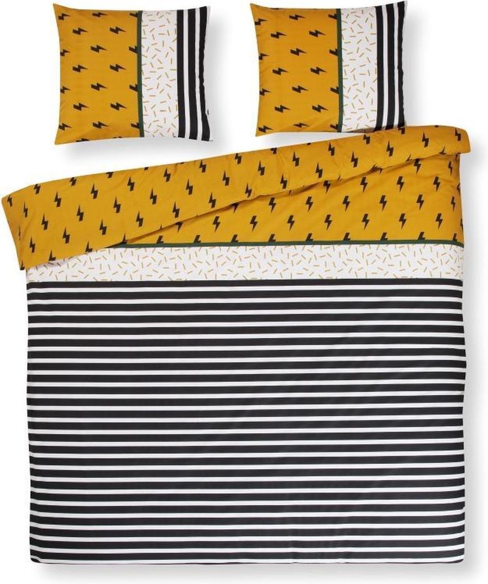 Dit stoere dekbedovertrek met zwart/wit streeppatroon, spikkels en bliksemschichten zorgt voor een leuke sfeer in je slaapkamer De kussenslopen hebben dezelfde afbeelding, waardoor je een mooi geheel creëert.