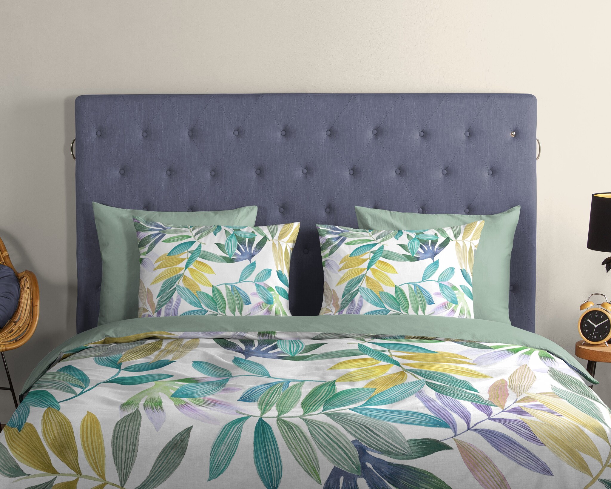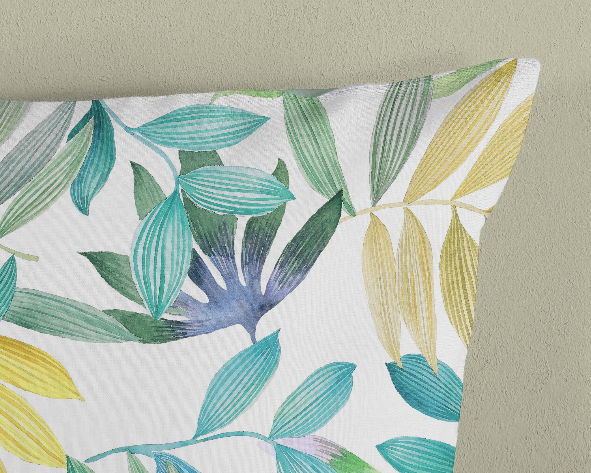 De achterzijde is uitgevoerd in een effen, zachte groentint die mooi aansluit bij het dessin aan de voorzijde. Hierdoor kun je eenvoudig afwisselen tussen een uitgesproken botanische look en een rustige basis.