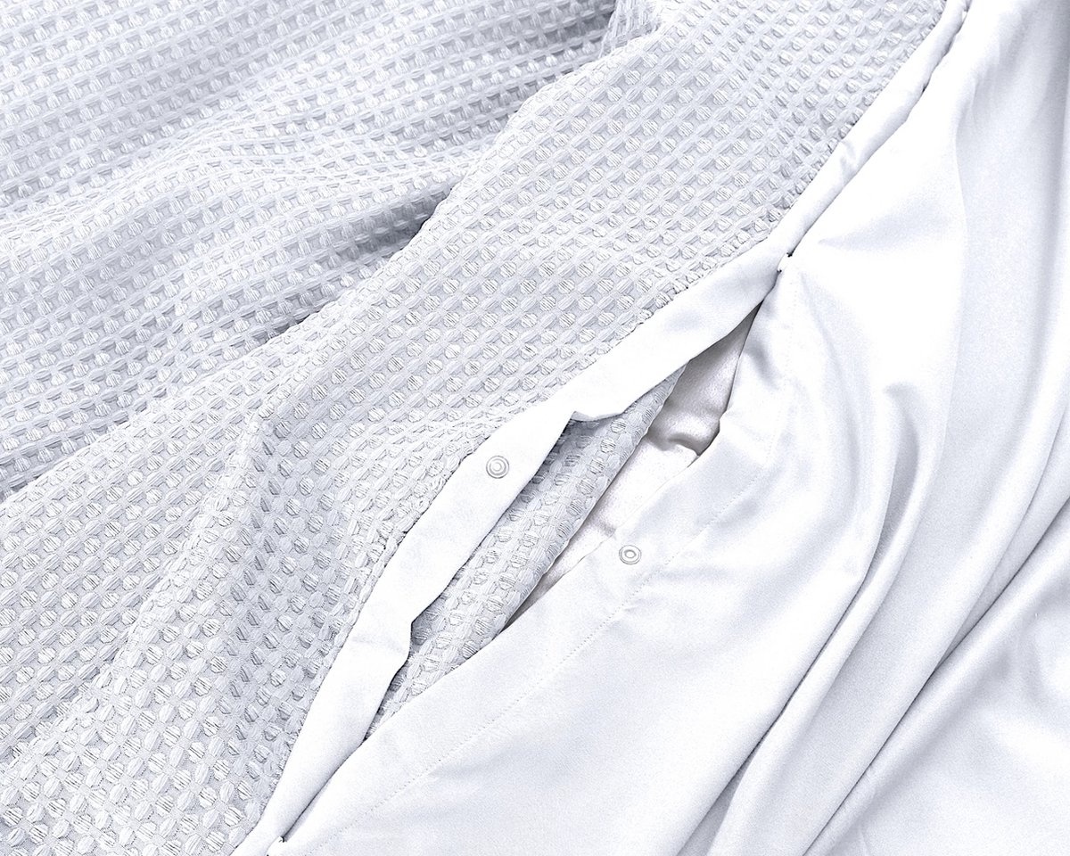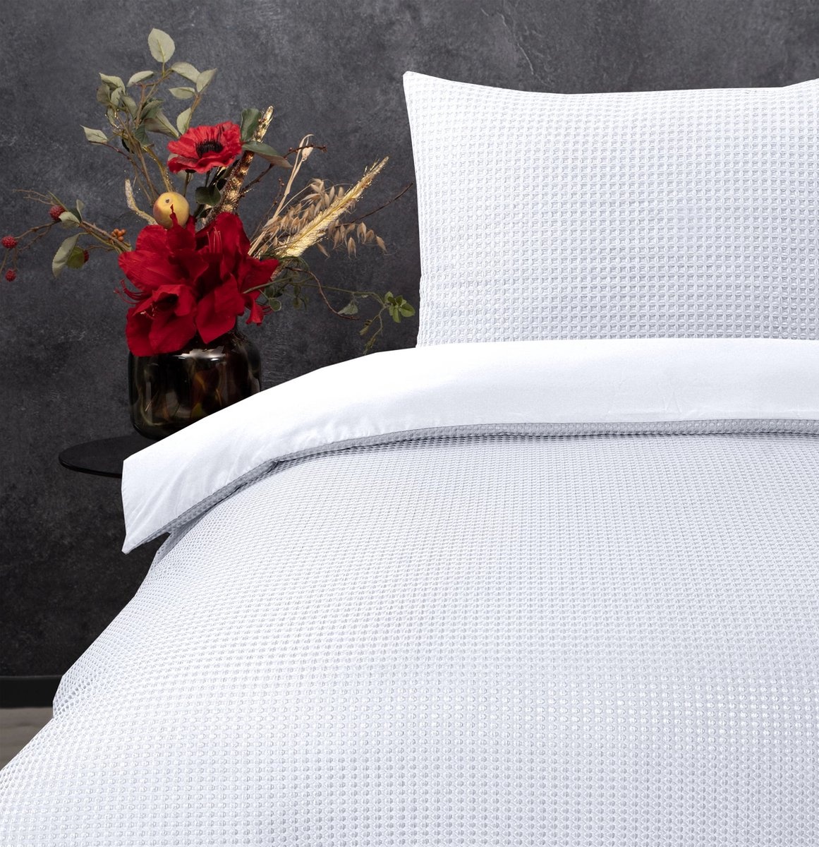 Het dekbedovertrek is aan de bovenkant gemaakt van extra zware kwaliteit waffel polyester. Dit materiaal is soepel en valt daardoor mooi op het bed. Het overtrek is daarnaast ook lekker zacht, sneldrogend en het kreukt nauwelijks. Hierdoor is dit dekbedovertrek fijn in gebruik. Het dekbedovertrek is daarnaast ademend, vochtabsorberend en luchtig, waardoor het dekbedovertrek bijdraagt aan jouw slaapcomfort.