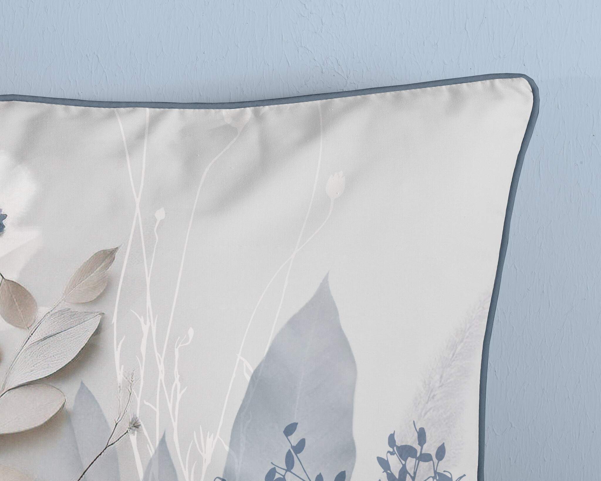 Het Descanso dekbedovertrek Junte Grijs heeft een verfijnd botanisch dessin met zachte bloemen en bladeren in koele grijs- en blauwtinten. Het lichte kleurgebruik en de subtiele schaduwen geven het ontwerp een rustige en moderne uitstraling met een natuurlijke elegantie.