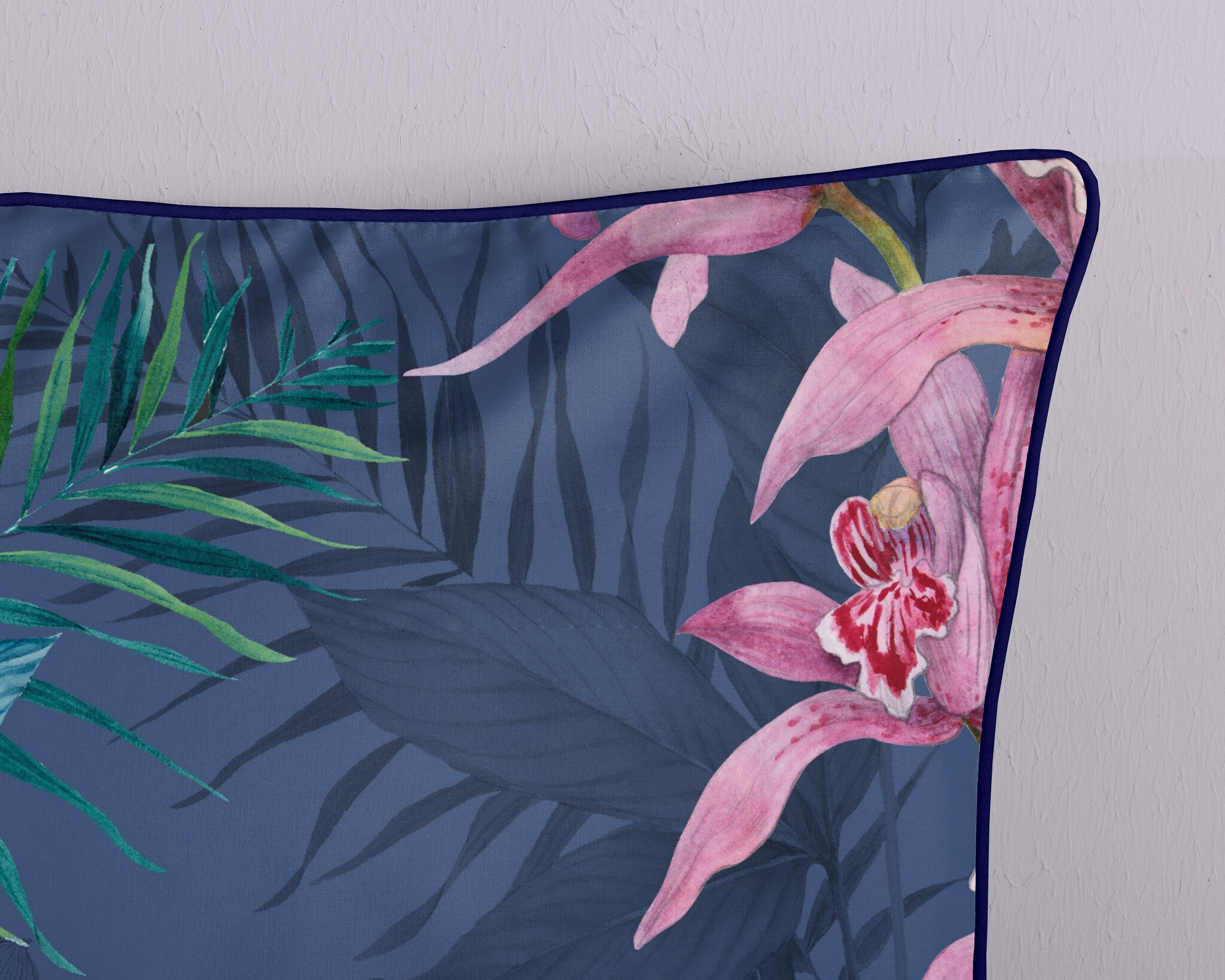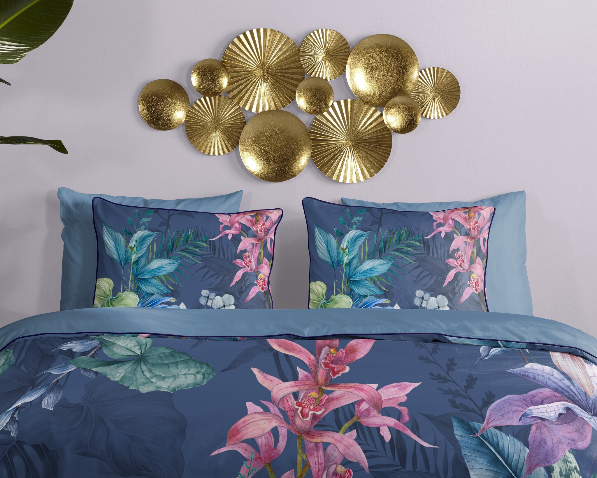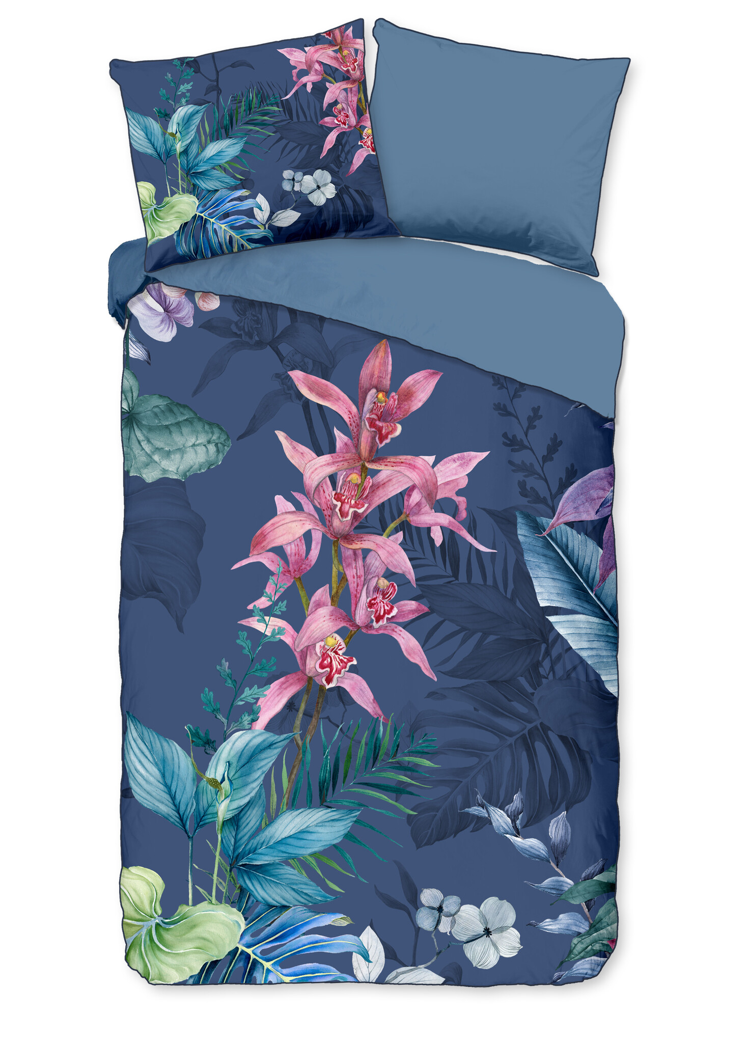 Het Descanso dekbedovertrek Mae Blauw combineert een diepe blauwtint met weelderige tropische bloemen en bladeren. De opvallende roze orchideeën en frisgroene accenten steken prachtig af tegen de donkere achtergrond, waardoor het dessin een luxe en levendige uitstraling krijgt.