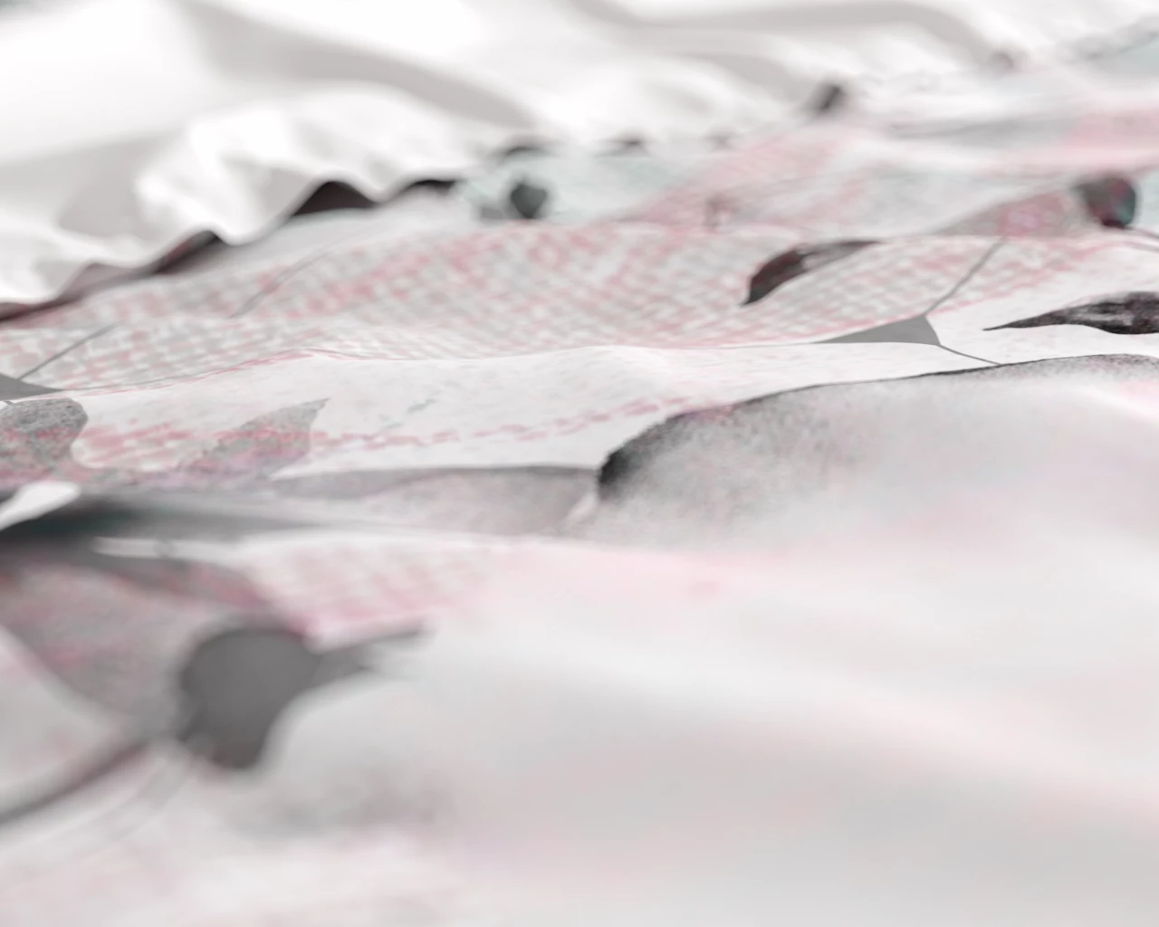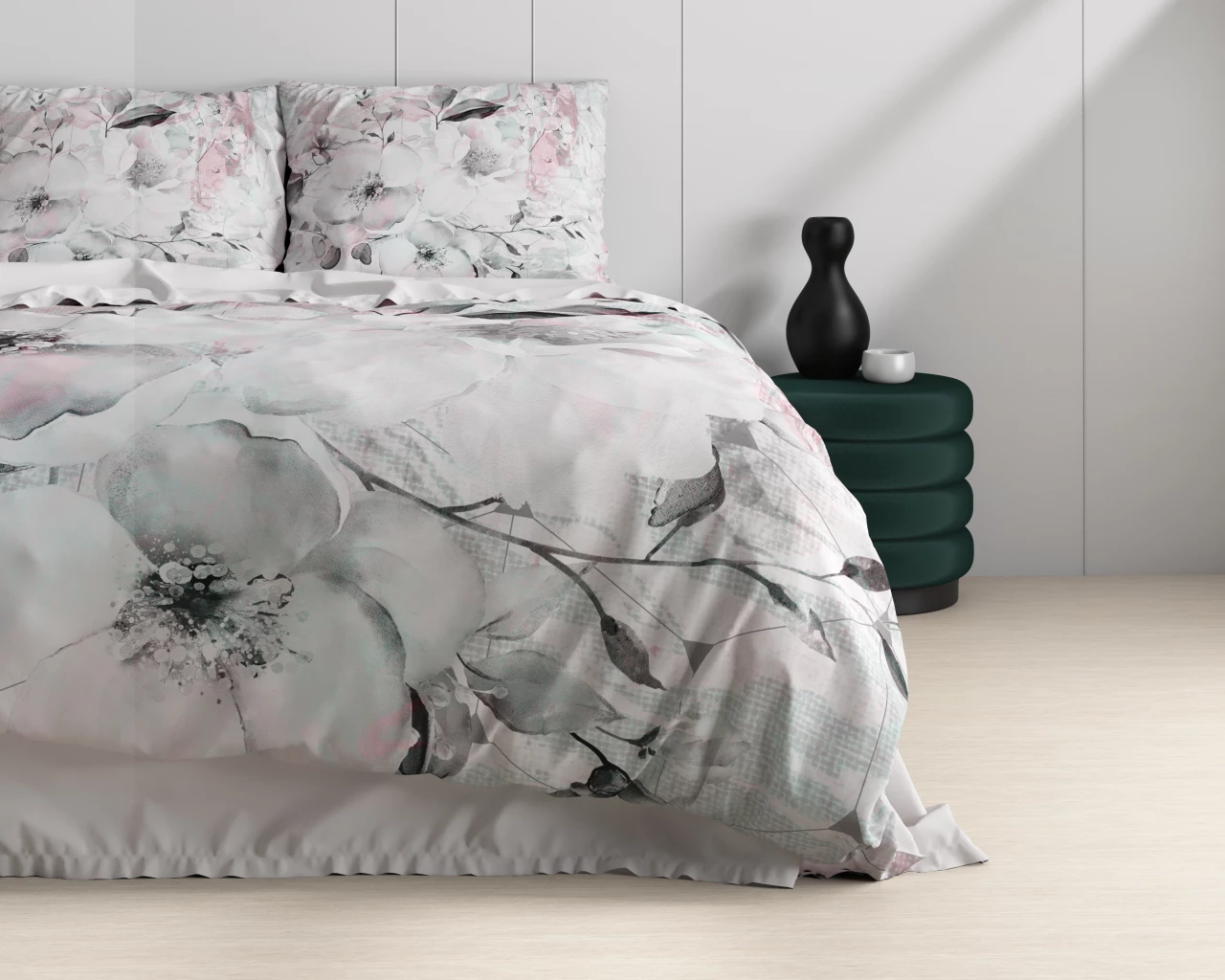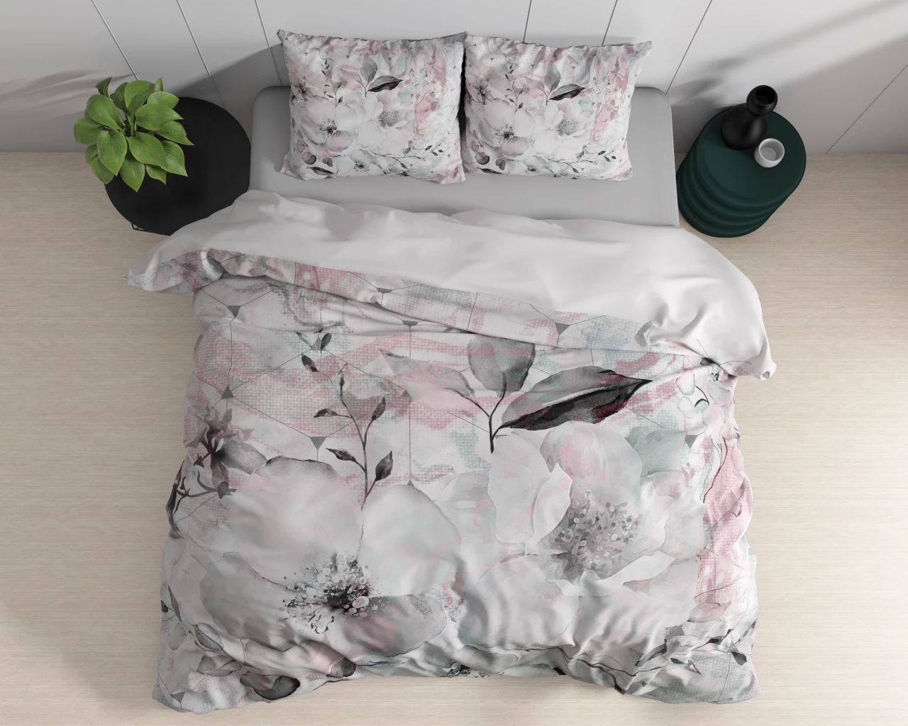 De zachte witte basis met subtiele grijs- en roze nuances creëert een rustige, frisse en luxe sfeer in de slaapkamer.