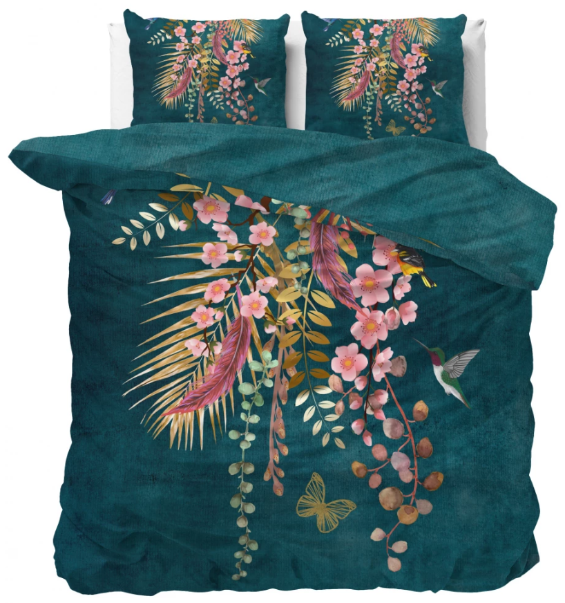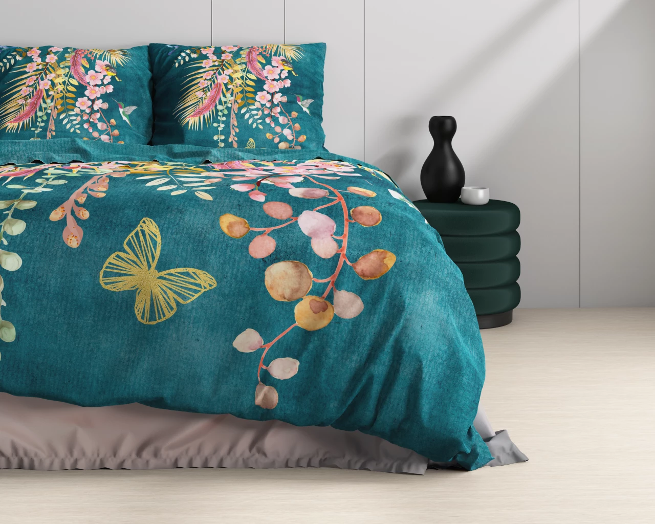 Het Dreamhouse Kamala Botanisch Groen dekbedovertrek heeft een rijke en elegante uitstraling dankzij de diepe petrolgroene basis gecombineerd met een verfijnd botanisch dessin. Sierlijke bloemen, exotische bladeren, kleurrijke veren en subtiele vlinders vormen samen een kunstzinnig geheel dat direct een luxe sfeer creëert in de slaapkamer.