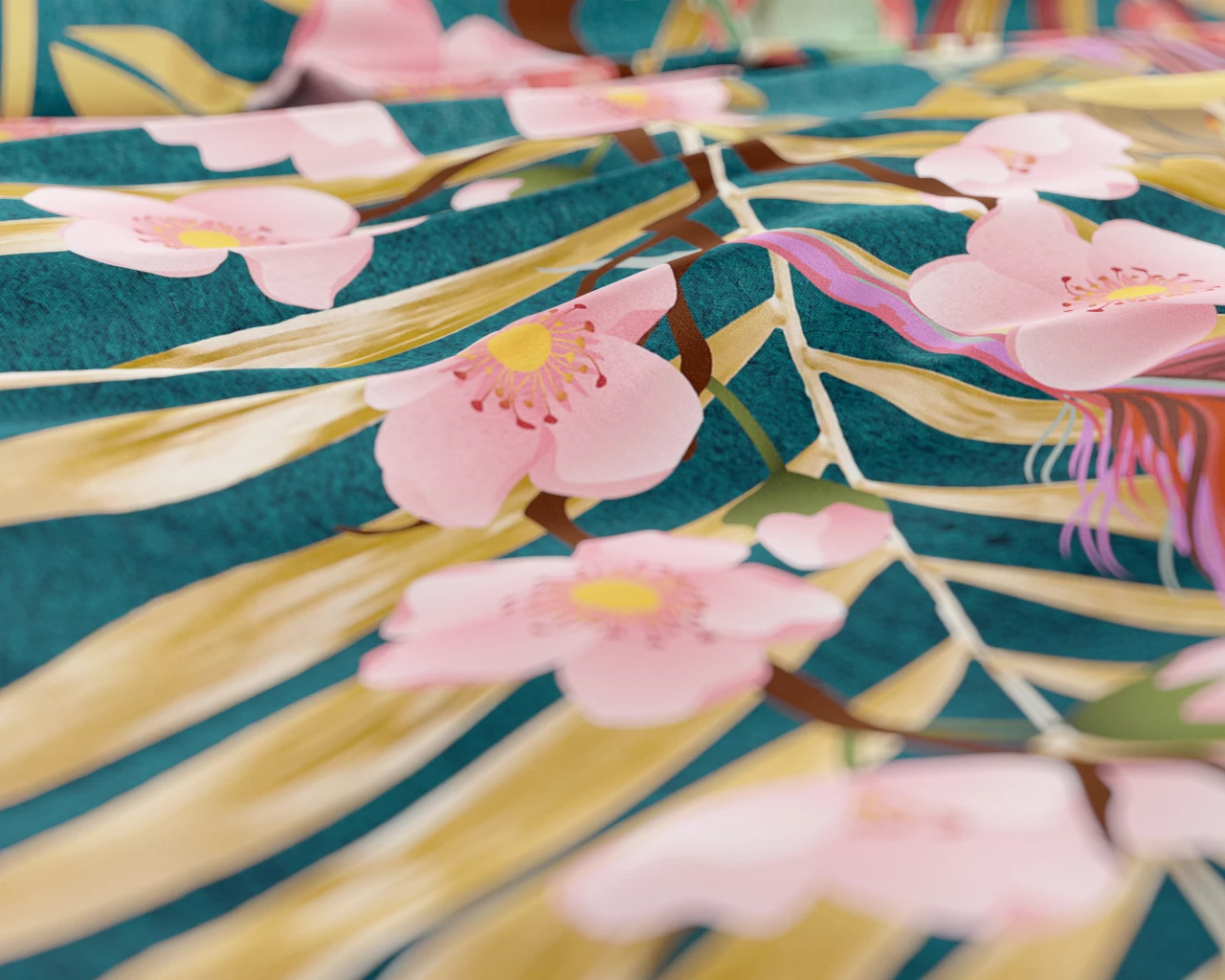 De speelse compositie van roze bloesems, zachte goudtinten en tropische accenten geeft dit overtrek een warme en stijlvolle uitstraling. Hierdoor past het perfect binnen een chic interieur en sluit het naadloos aan bij liefhebbers van een uitgesproken bloemen dekbedovertrek met een exclusieve uitstraling, kenmerkend voor een hoogwaardig Dreamhouse dekbedovertrek.