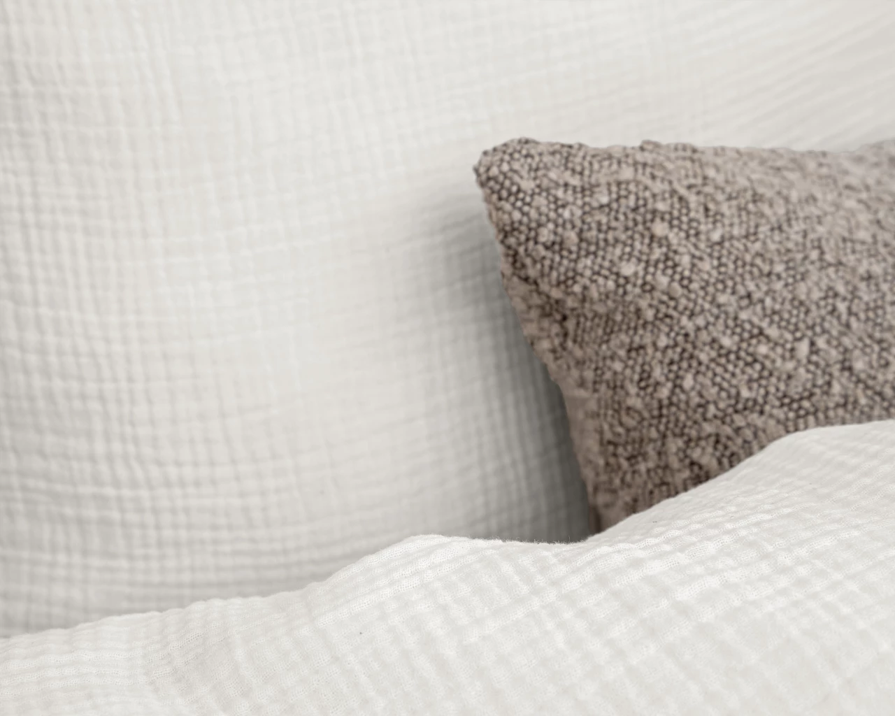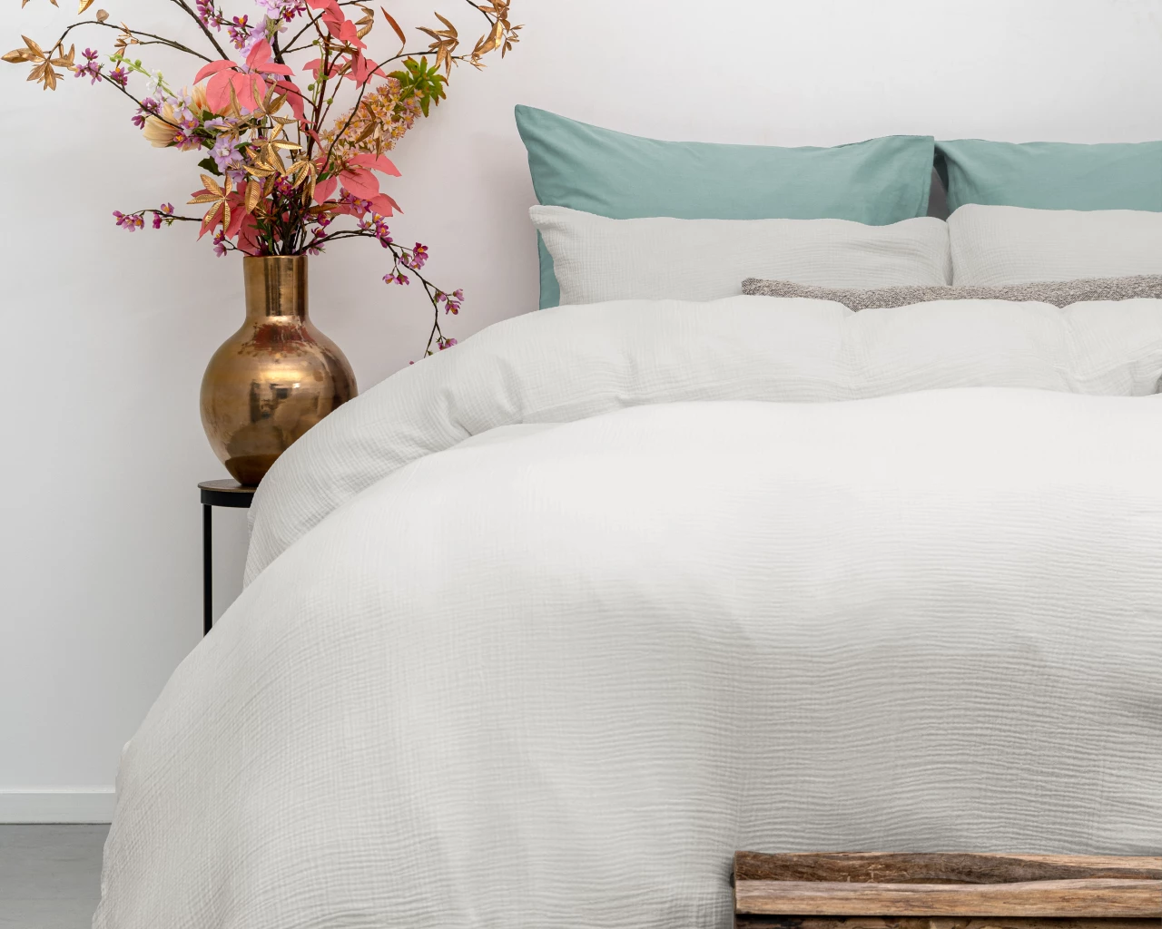 Dit dekbedovertrek is vervaardigd uit 100% katoen mousseline met een percaline weving van T144, wat zorgt voor een zachte, duurzame en ademende kwaliteit. De luchtig geweven stof voelt soepel aan en heeft een subtiel kreukeleffect dat bijdraagt aan de natuurlijke luxe uitstraling.