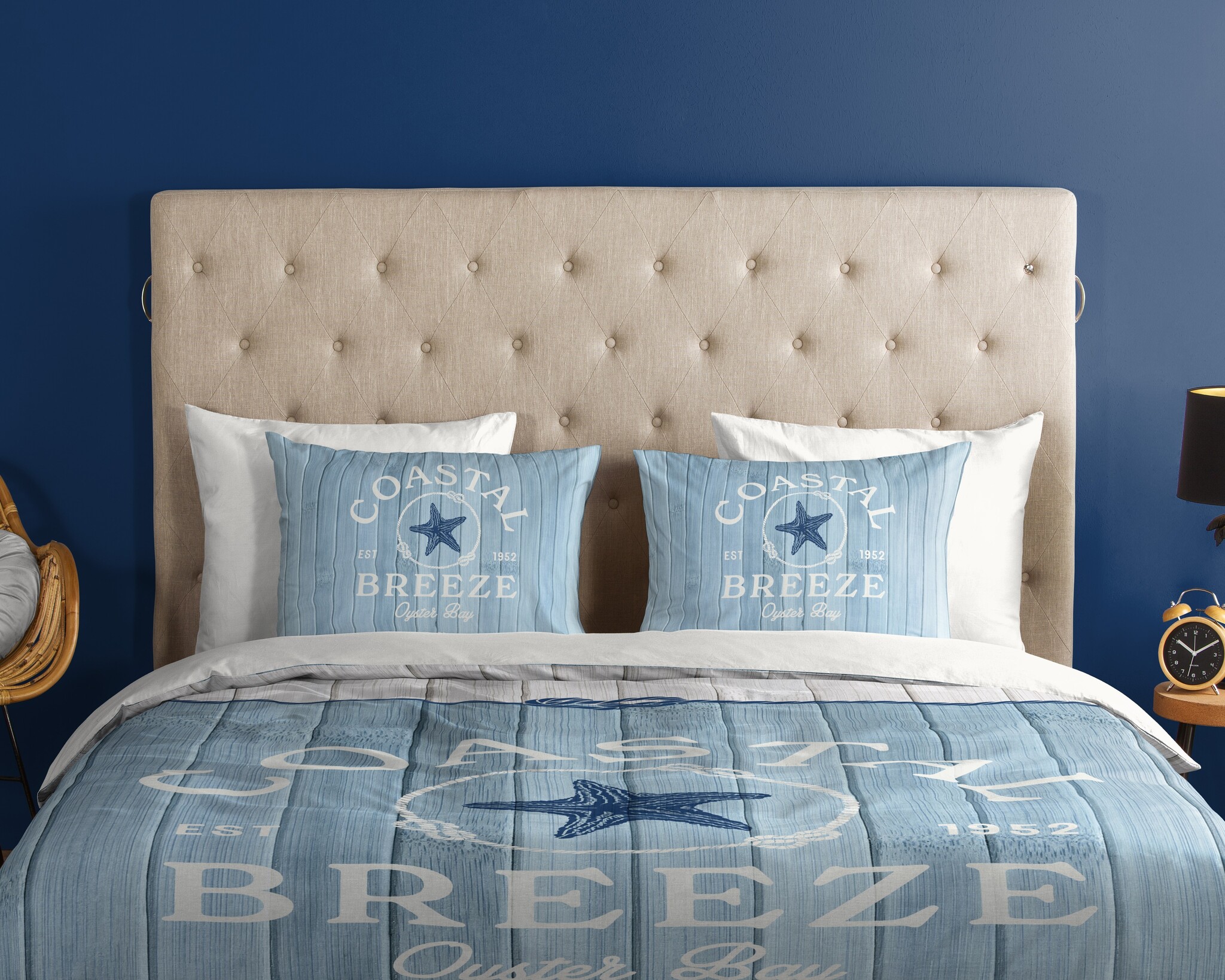 Het Good Morning Breeze blauw dekbedovertrek heeft een frisse maritieme uitstraling met een decoratieve tekstprint en nautische details. De combinatie van houtlook strepen, touwaccenten en de opdruk “Coastal Breeze” geeft het overtrek een ontspannen strandsfeer. Breeze blauw is daardoor een stijlvolle keuze binnen de tekst dekbedovertrekken categorie.
