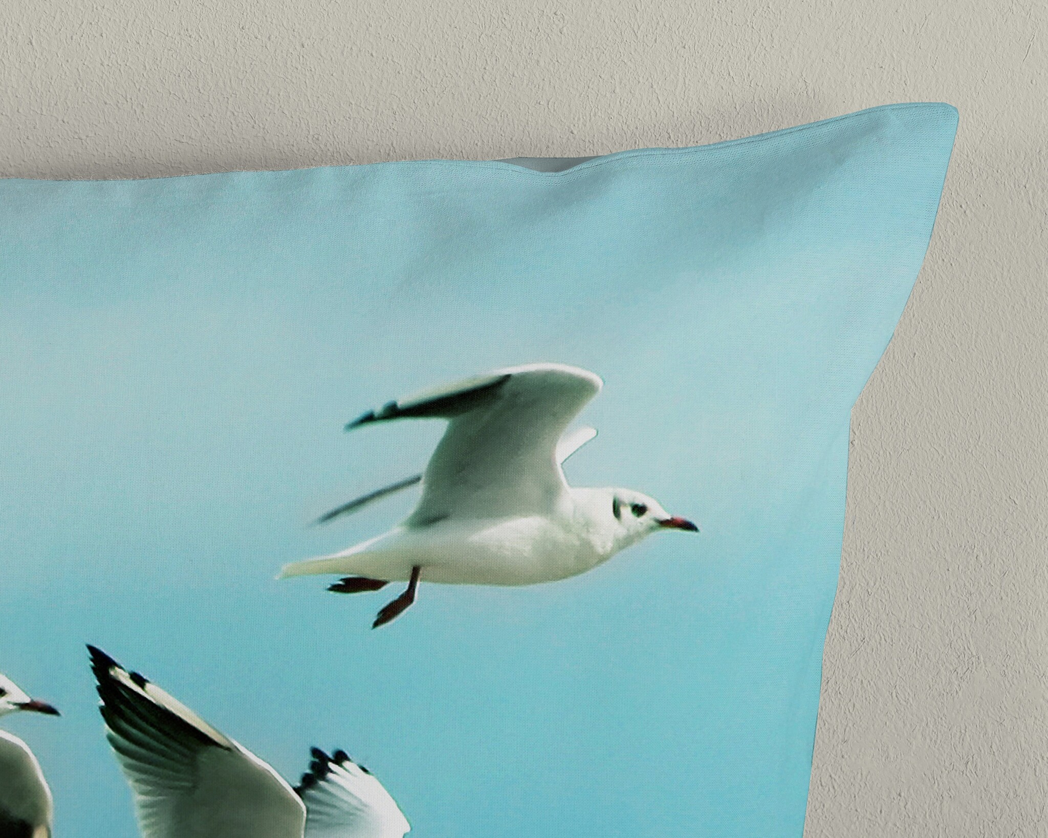 De achterzijde is uitgevoerd in een effen, zachte blauwtint die mooi aansluit bij het dessin. Zo creëer je eenvoudig een rustige uitstraling wanneer je het overtrek omslaat.