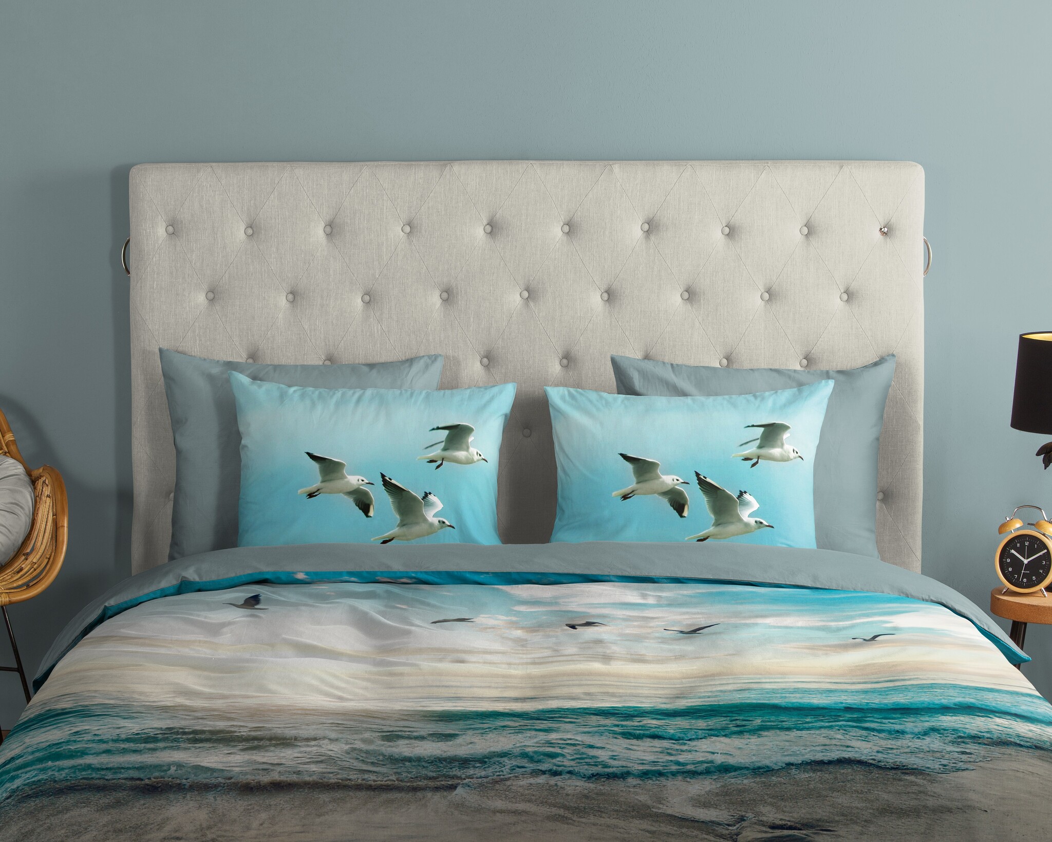 Het Good Morning Brisa blauw dekbedovertrek brengt direct een frisse zeebries de slaapkamer in. Het dessin toont een helder strandtafereel met golven, lucht en meeuwen in zachte blauwtinten. De combinatie van zee, lucht en licht zorgt voor een ontspannen en ruimtelijk gevoel. Brisa blauw is daardoor een perfecte keuze binnen de strand dekbedovertrekken categorie.