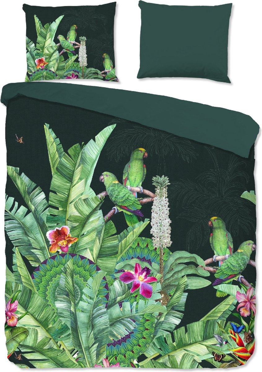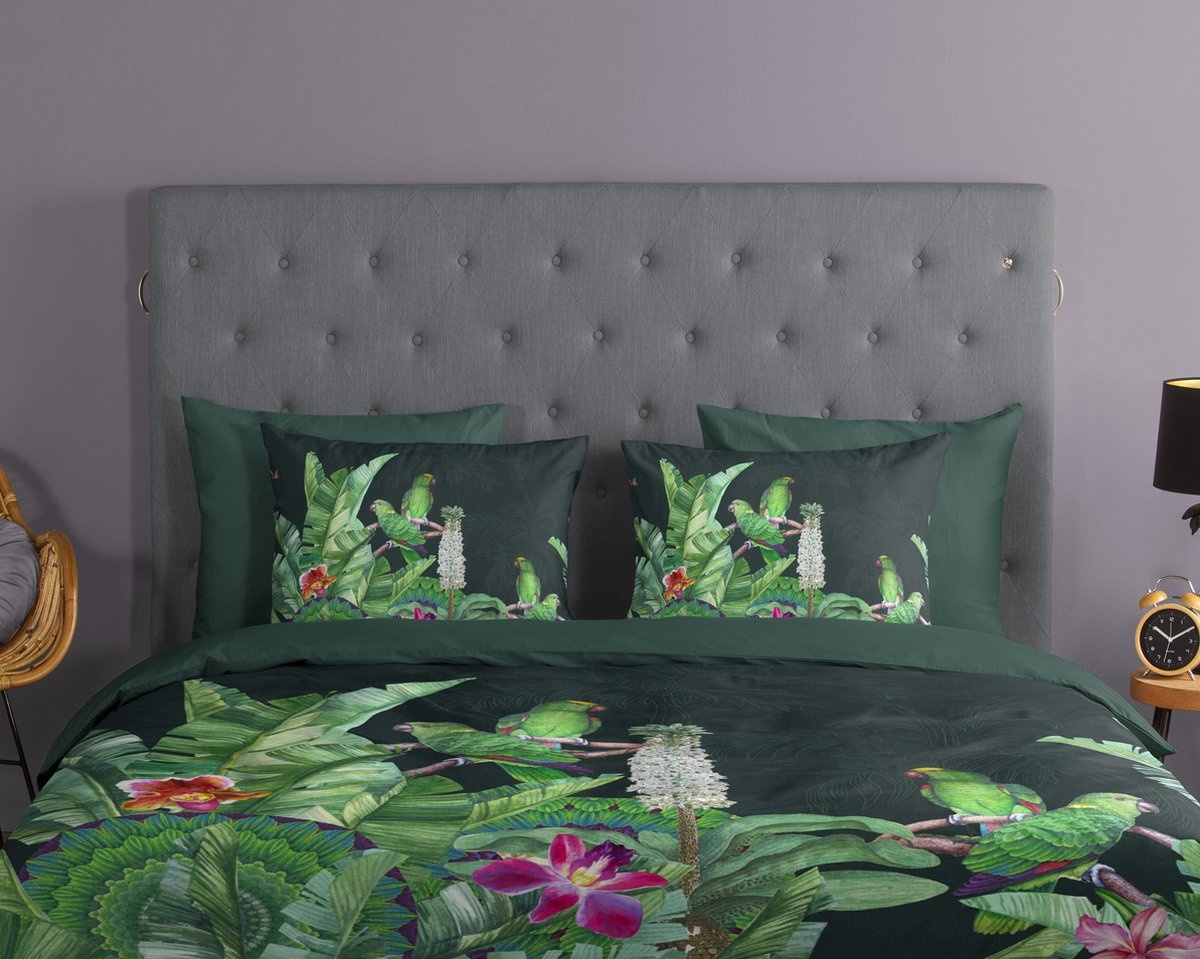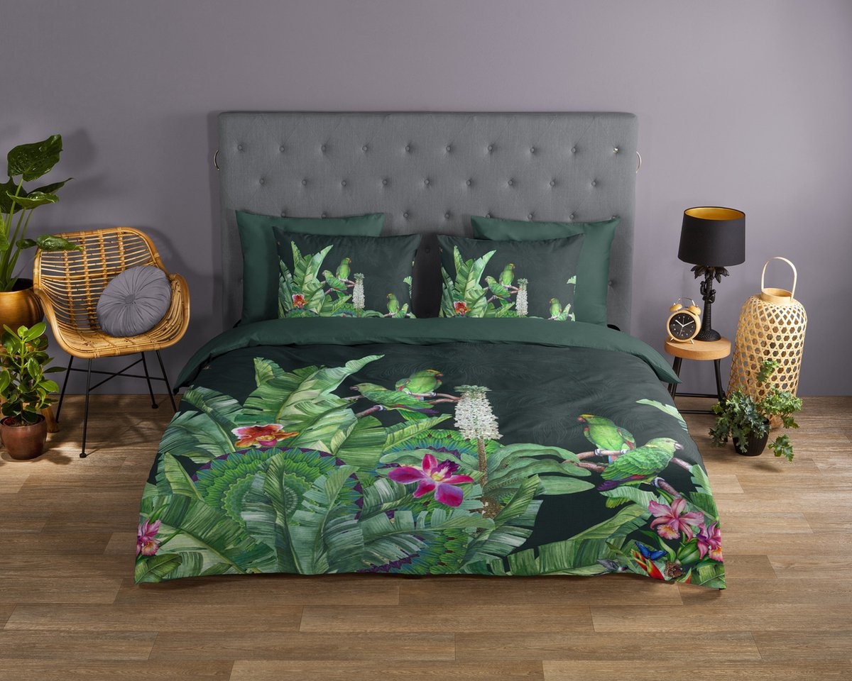 De achterzijde is uitgevoerd in een effen donkergroene kleur, waardoor het dekbedovertrek mooi in balans blijft en ook geschikt is voor een rustigere styling. Door deze combinatie wissel je eenvoudig tussen een uitgesproken junglelook en een meer ingetogen uitstraling.