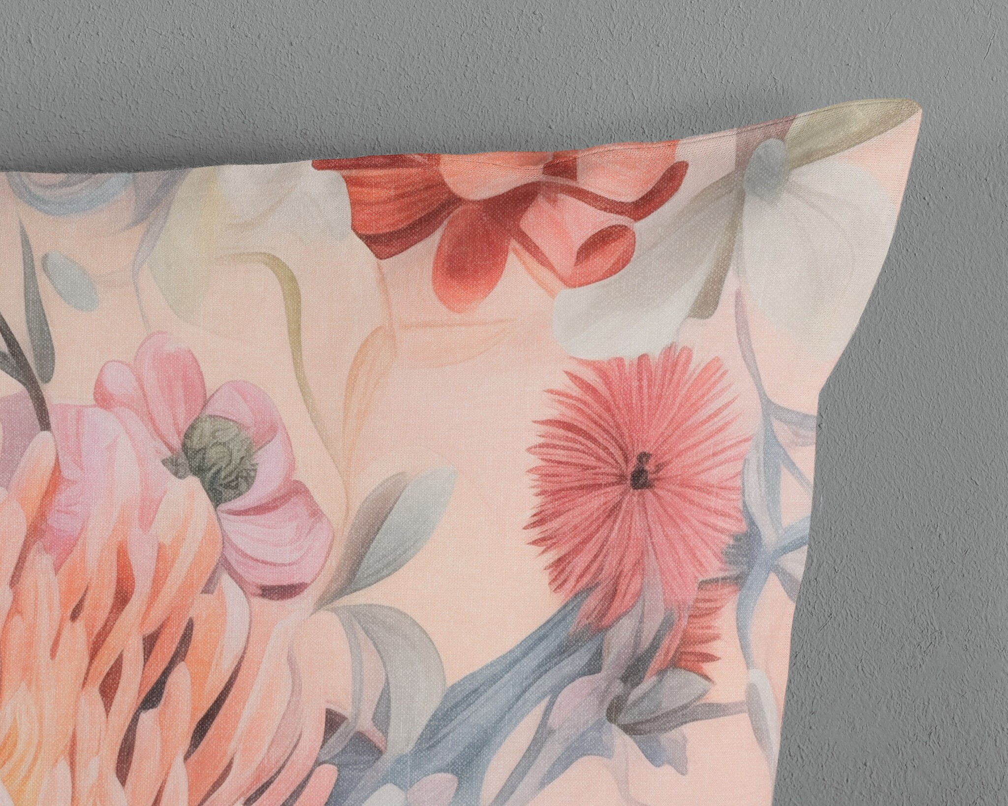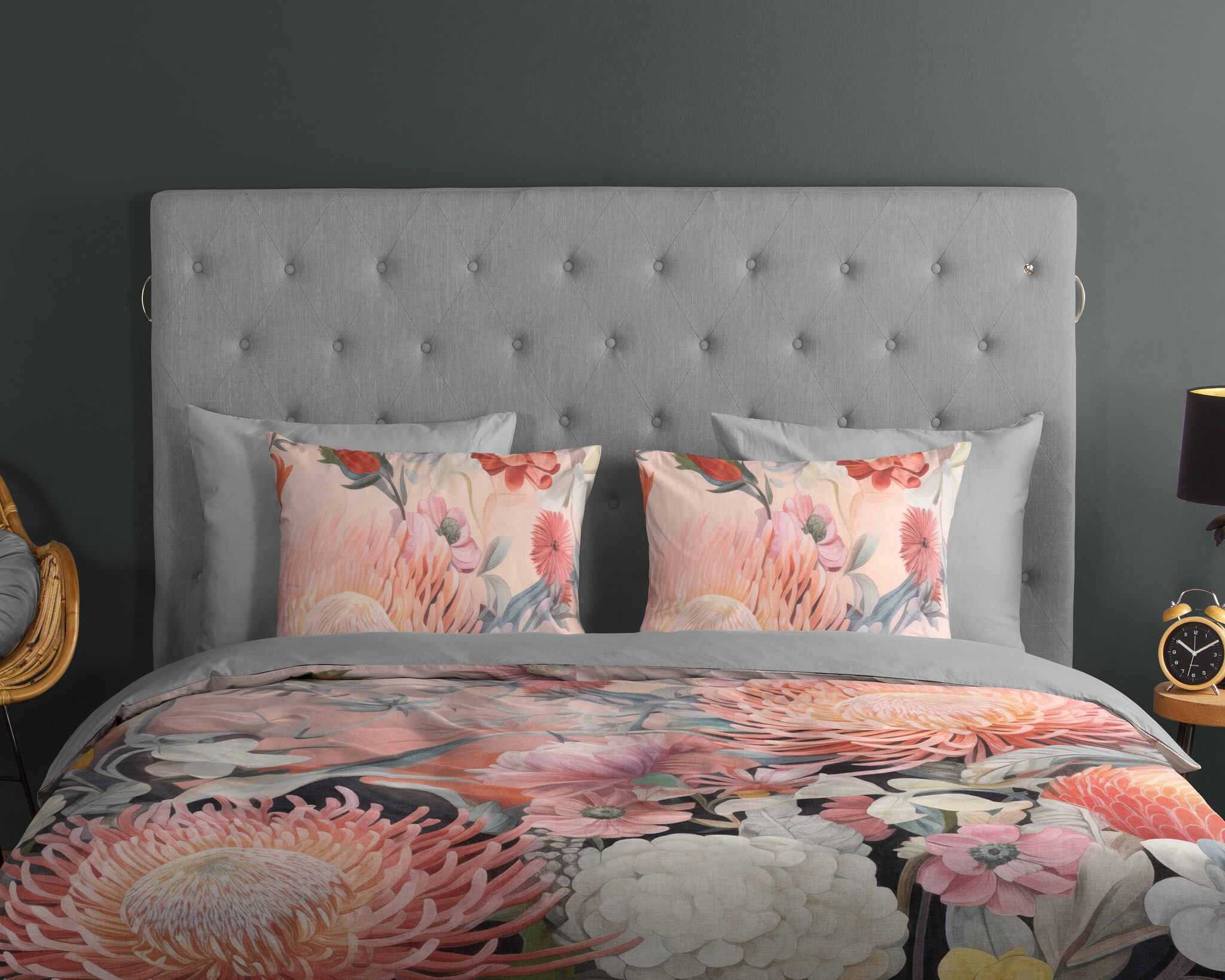 De achterzijde is uitgevoerd in een effen, zachte grijsgroene tint die perfect aansluit bij de warme kleuren van het dessin. Zo wissel je eenvoudig tussen een uitbundige bloemenprint en een rustige, effen look.