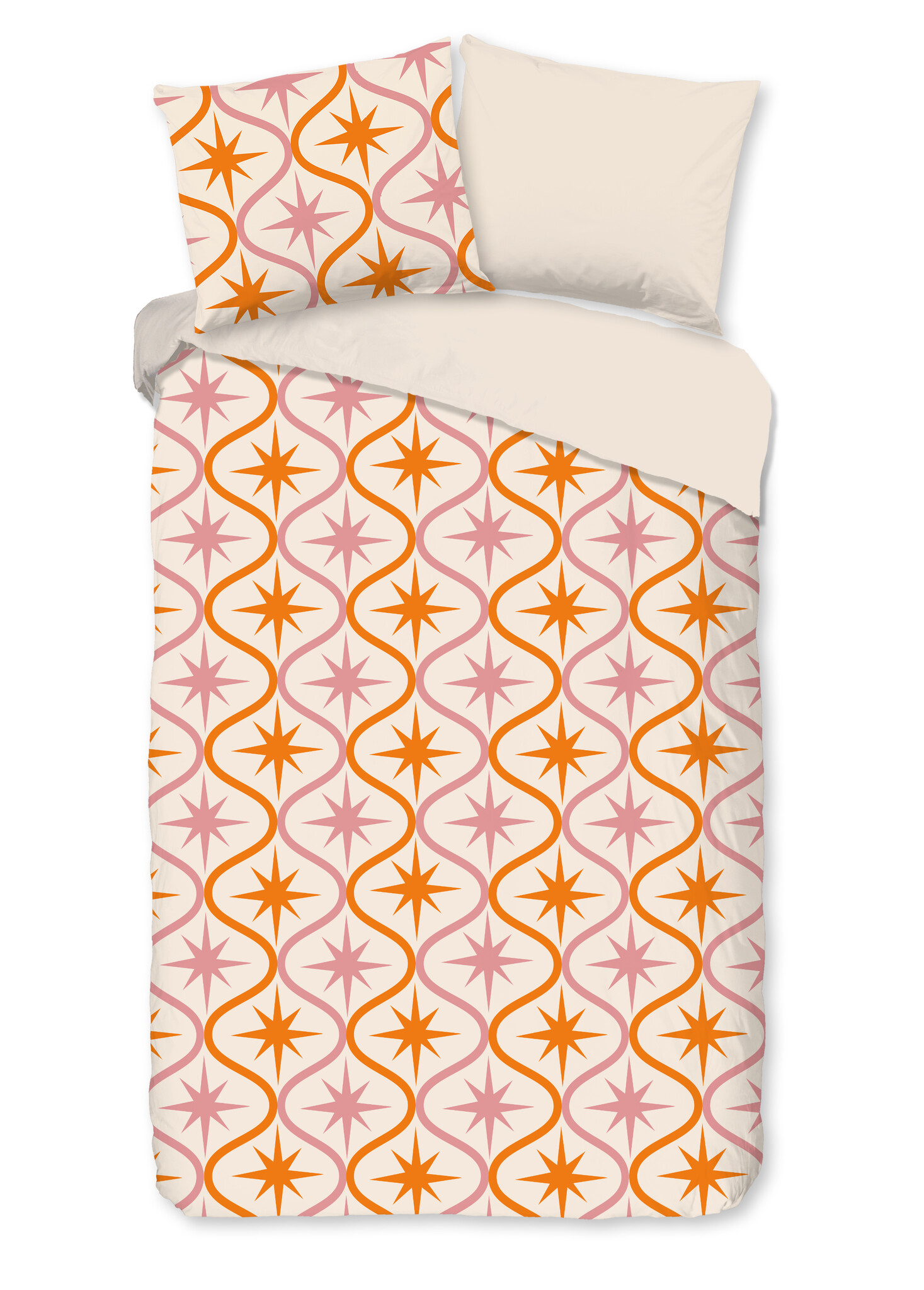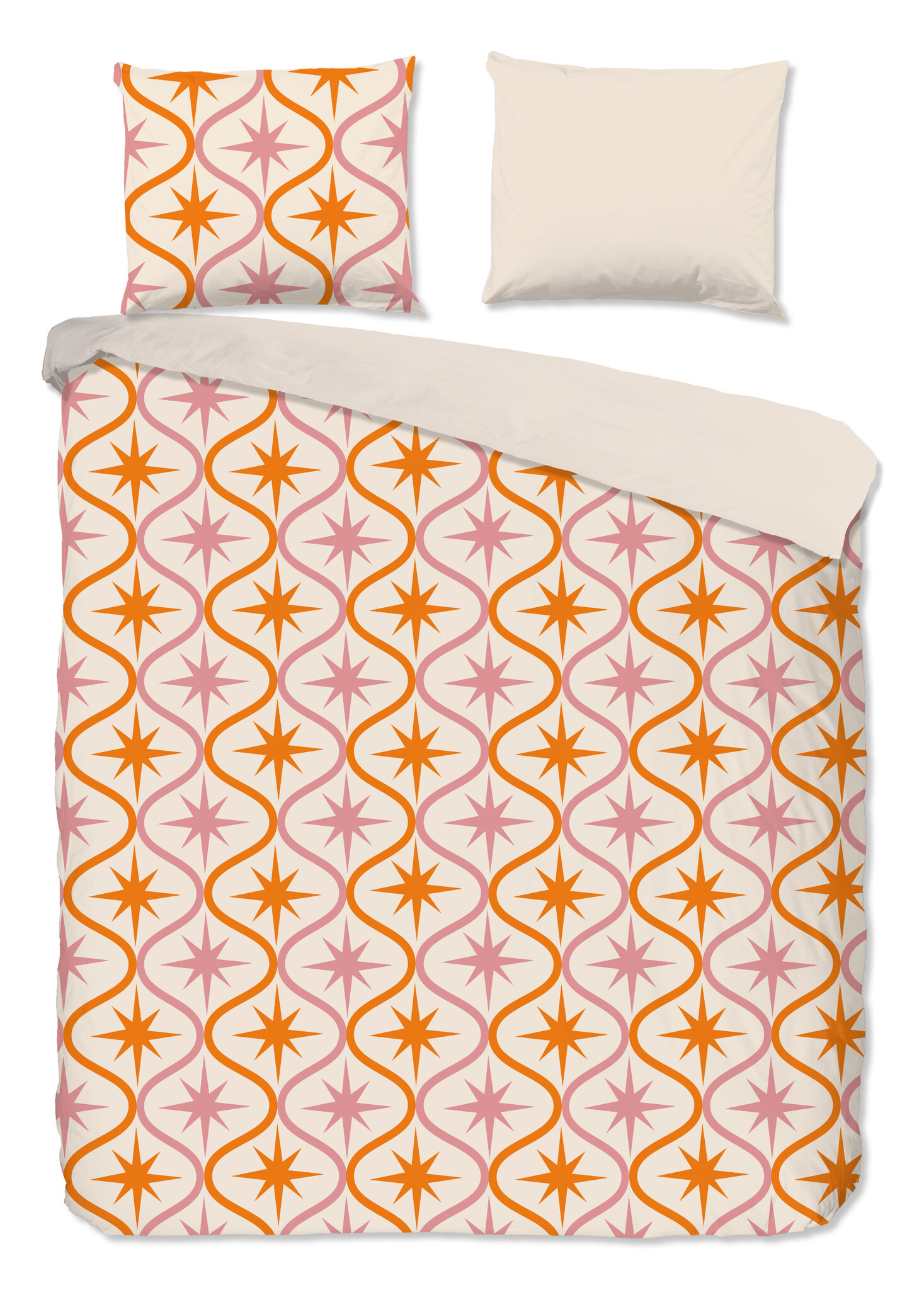 Het Good Morning Eleonor zand dekbedovertrek heeft een opvallend geometrisch dessin met stervormige figuren in warme oranje- en zachte rozetinten op een lichte zandkleurige ondergrond. Het patroon heeft een subtiele retro uitstraling en brengt tegelijk warmte en speelsheid in de slaapkamer. Eleonor zand is daarmee een echte blikvanger binnen de figuren dekbedovertrekken categorie.