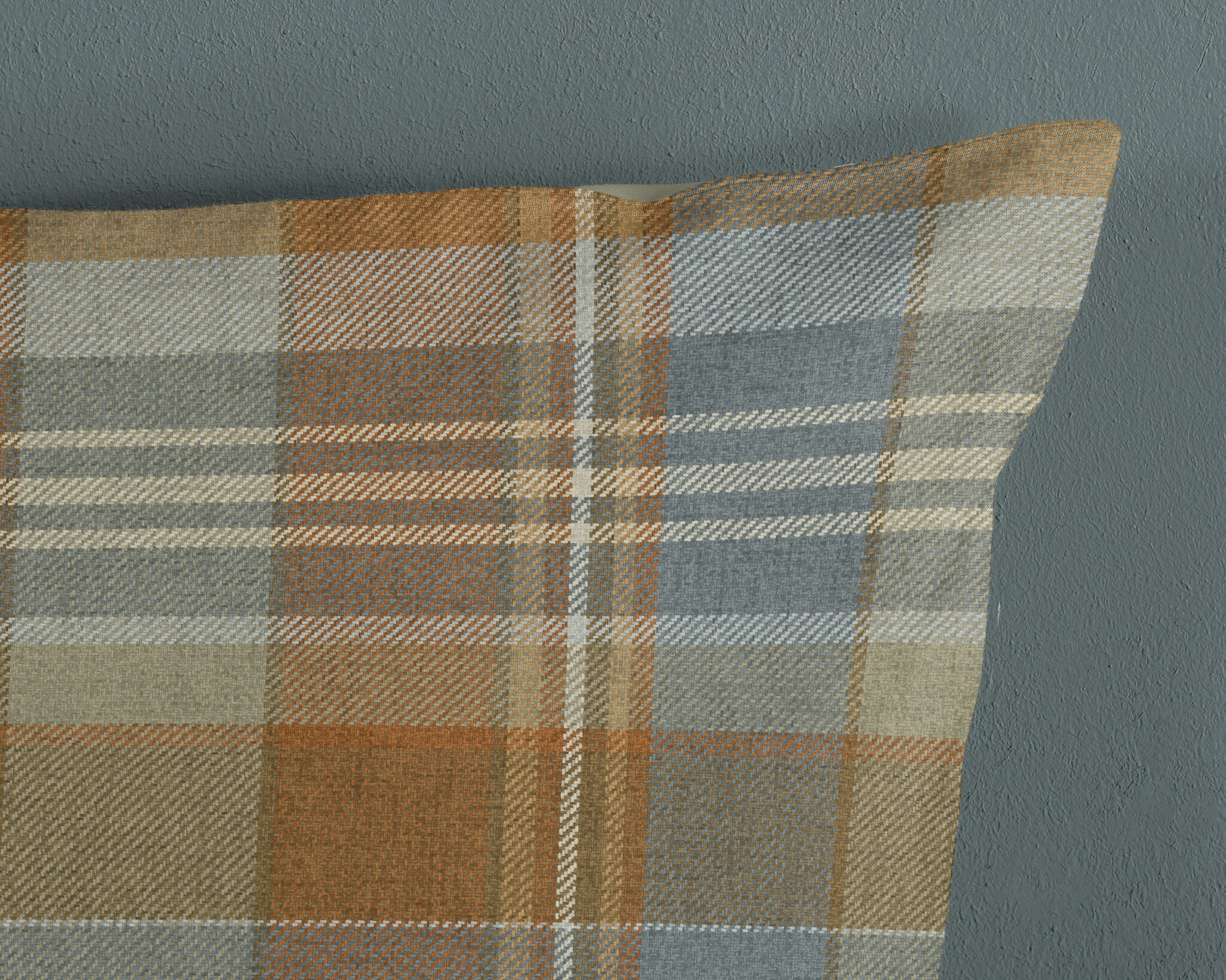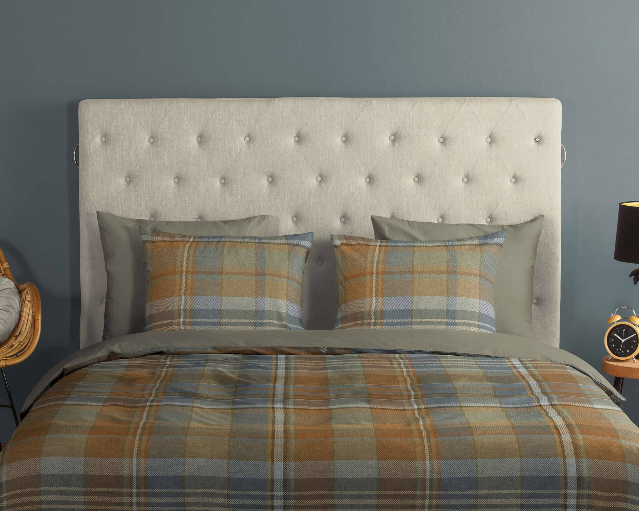 De achterzijde is uitgevoerd in een effen zachte grijsgroene tint die mooi aansluit bij de kleuren van het ruitpatroon. Zo wissel je eenvoudig tussen een uitgesproken ruitdessin en een rustige effen look.