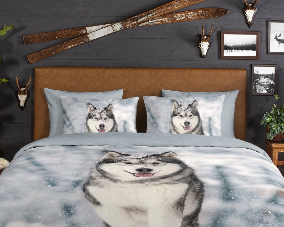 Het Good Morning Husky Grijs flanel dekbedovertrek brengt een krachtige winterse uitstraling naar de slaapkamer. Het indrukwekkende dessin toont een prachtige husky in een besneeuwd landschap, uitgevoerd in stijlvolle grijs- en wittinten. Een echte eyecatcher voor liefhebbers van honden dekbedovertrekken en natuur geïnspireerde prints.