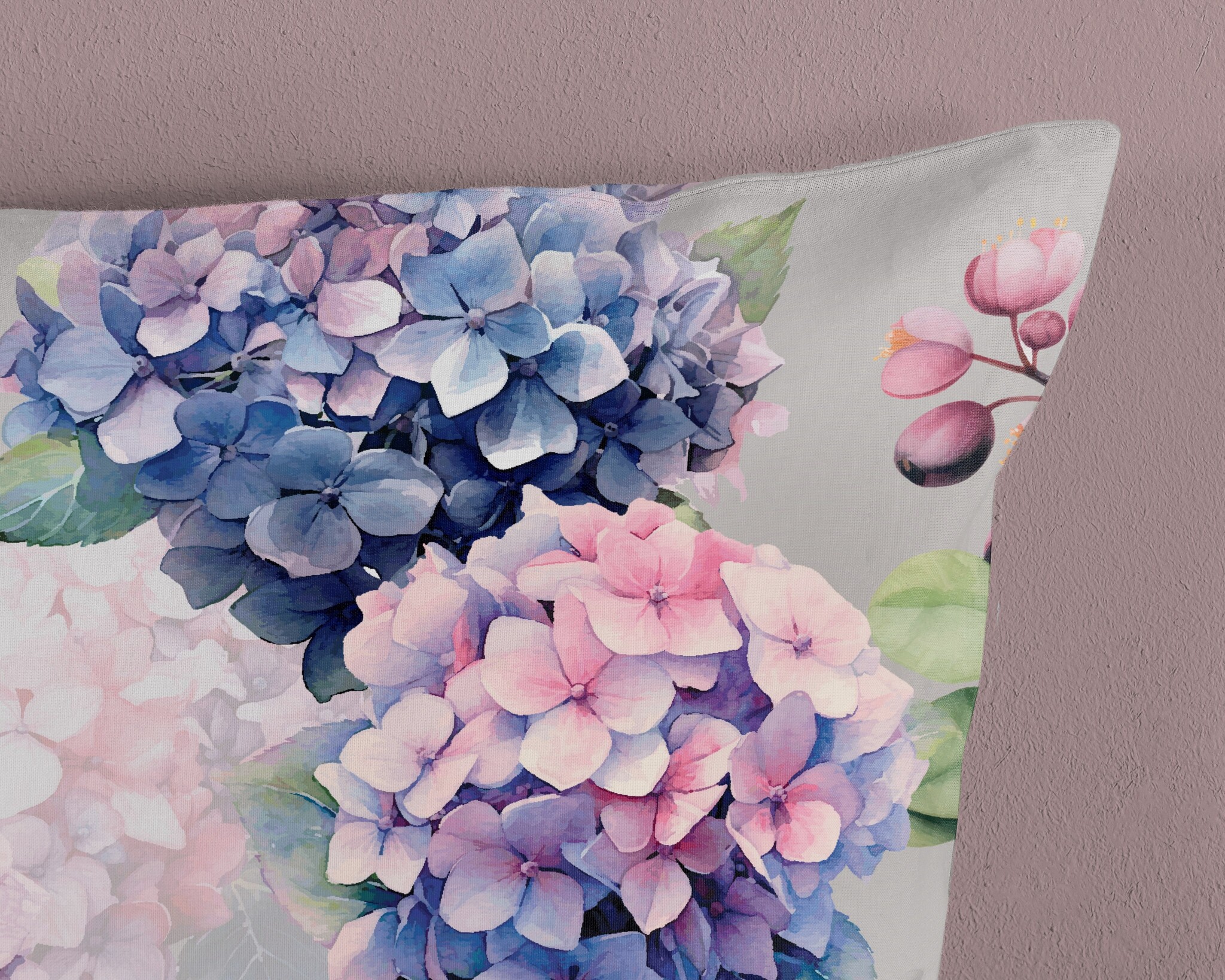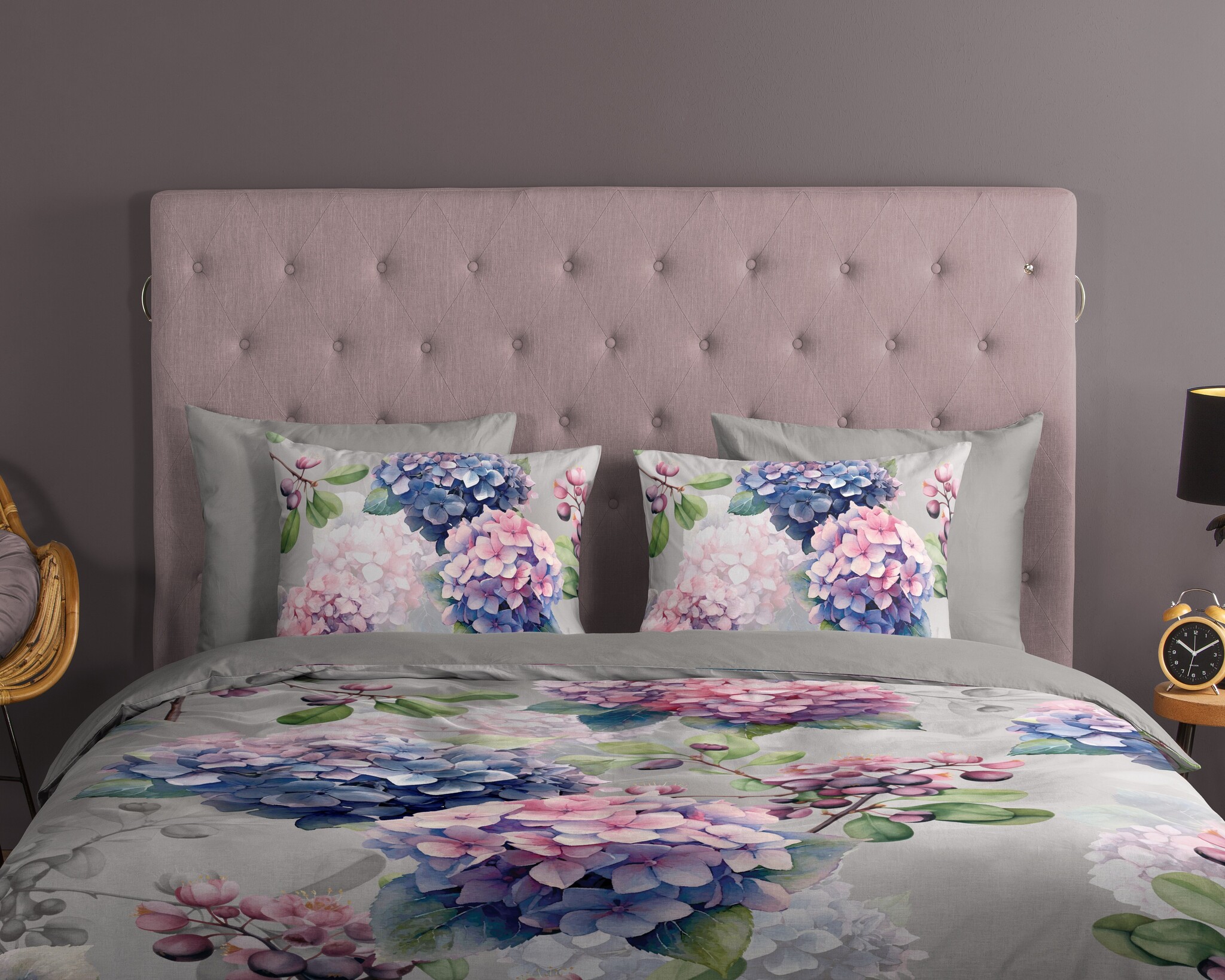 Het Good Morning Julia grijs dekbedovertrek heeft een stijlvol dessin met grote hortensia-achtige bloemen in zachte tinten blauw, roze en paars op een rustige grijze ondergrond. De aquarelachtige uitstraling geeft het overtrek een elegante en serene sfeer. Julia grijs is een verfijnde keuze binnen de bloemen dekbedovertrekken categorie.