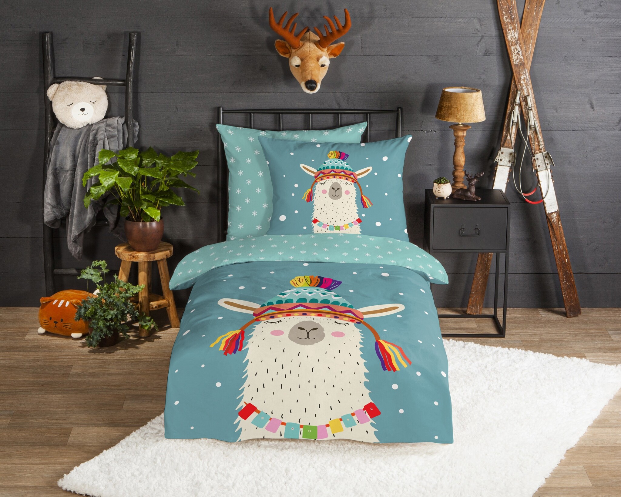Het speelse lama-dessin en de petrolkleur geven de kinderkamer een warme en gezellige uitstraling.