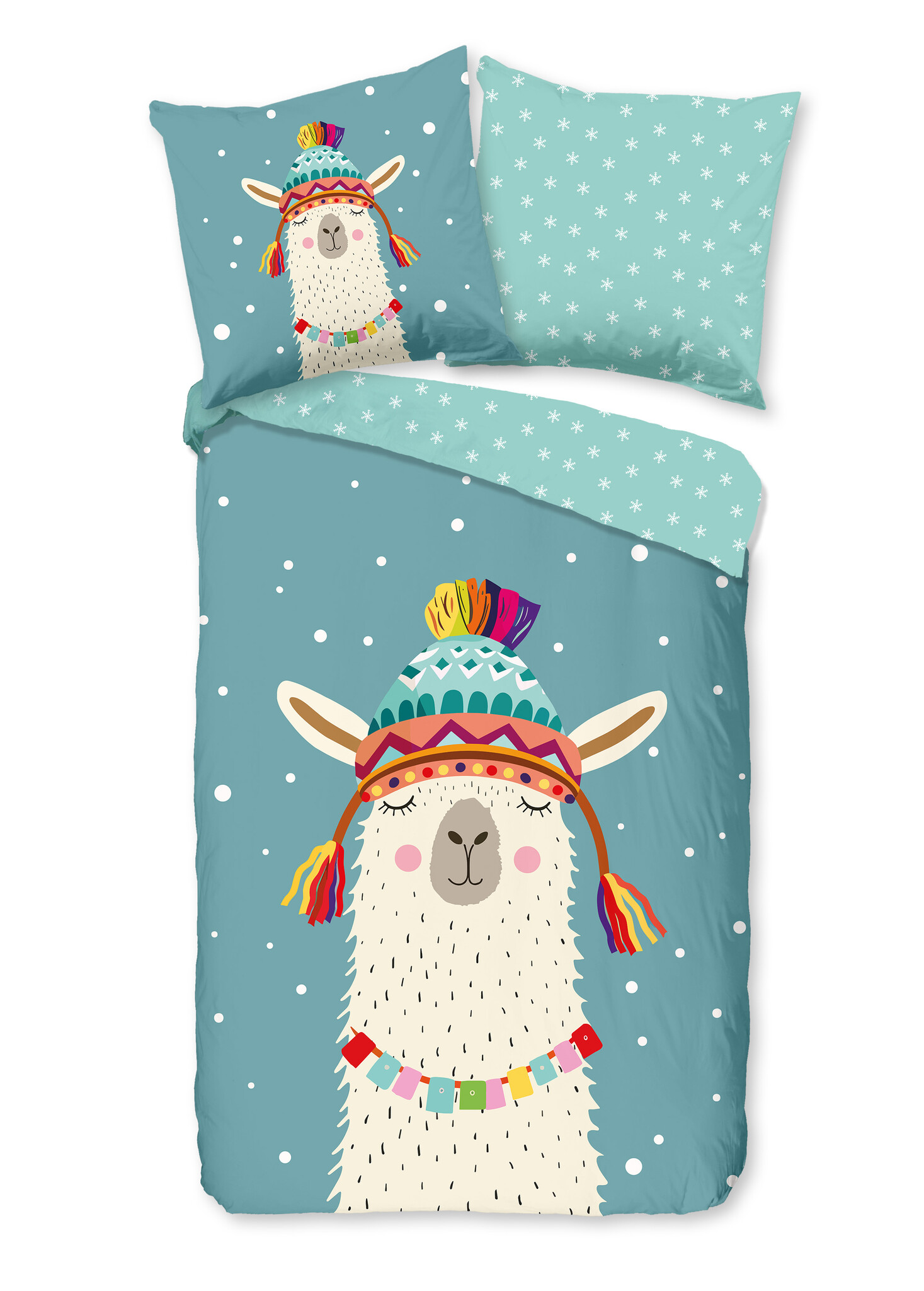 Dit vrolijke dekbedovertrek heeft een speels dessin met een schattige lama met kleurrijke muts en details op een frisse petrolgroene achtergrond. De combinatie van zachte kleuren en speelse illustratie geeft de kinderkamer een gezellige en fantasierijke uitstraling.