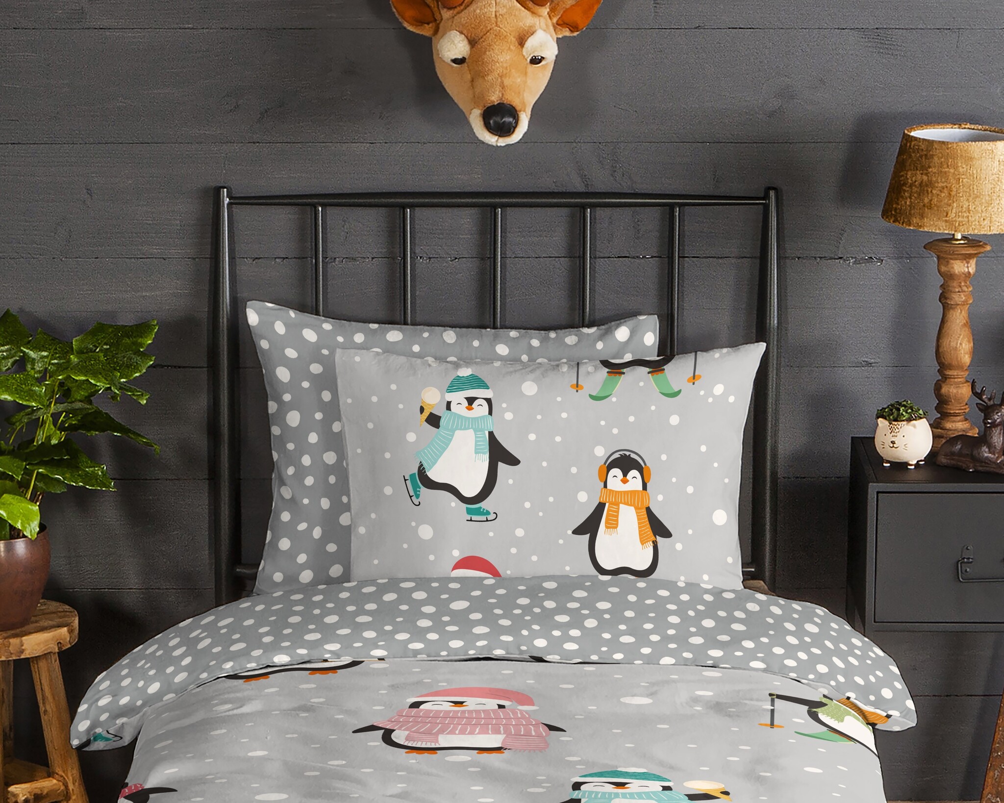 Good Morning Kids Liam Grijs Dekbedovertrek – Speelse Pinguïns in Winterthema