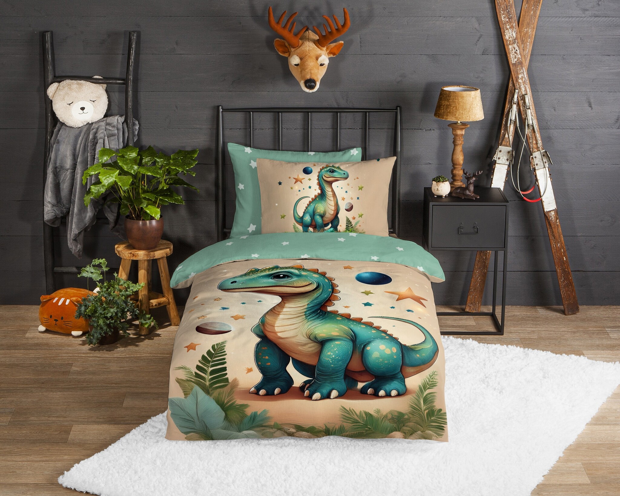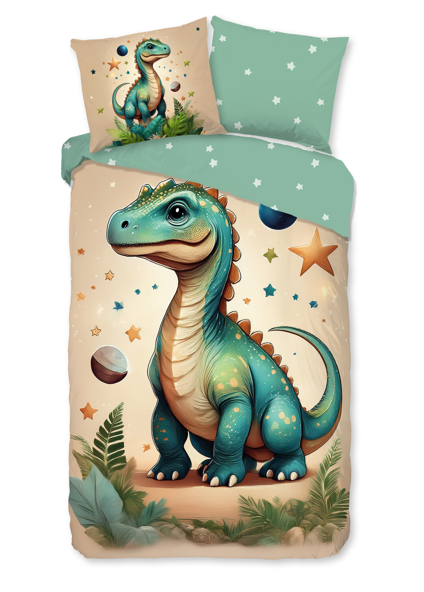 Dit speelse dekbedovertrek heeft een vrolijk dessin met een schattige dino, sterren en planeten op een zachte groene achtergrond. De combinatie van warme natuurtinten en fantasierijke details zorgt voor een avontuurlijke en gezellige sfeer in de kinderkamer.