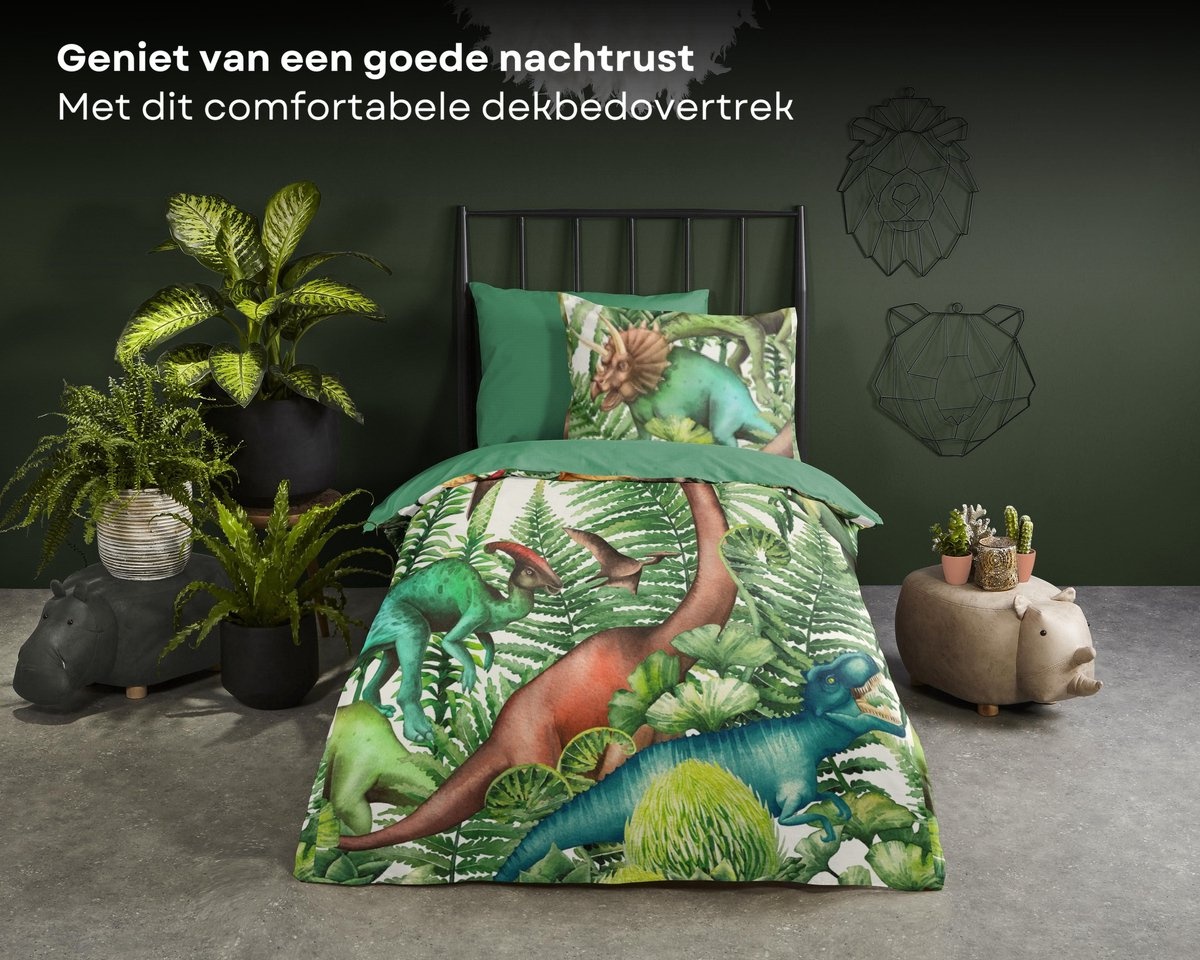 Het Good Morning Kids Prehistory Groen dekbedovertrek brengt de prehistorische jungle tot leven. Realistische dinosaurussen, groene bladmotieven en een stoere uitstraling maken dit ontwerp perfect voor avontuurlijke kinderen.