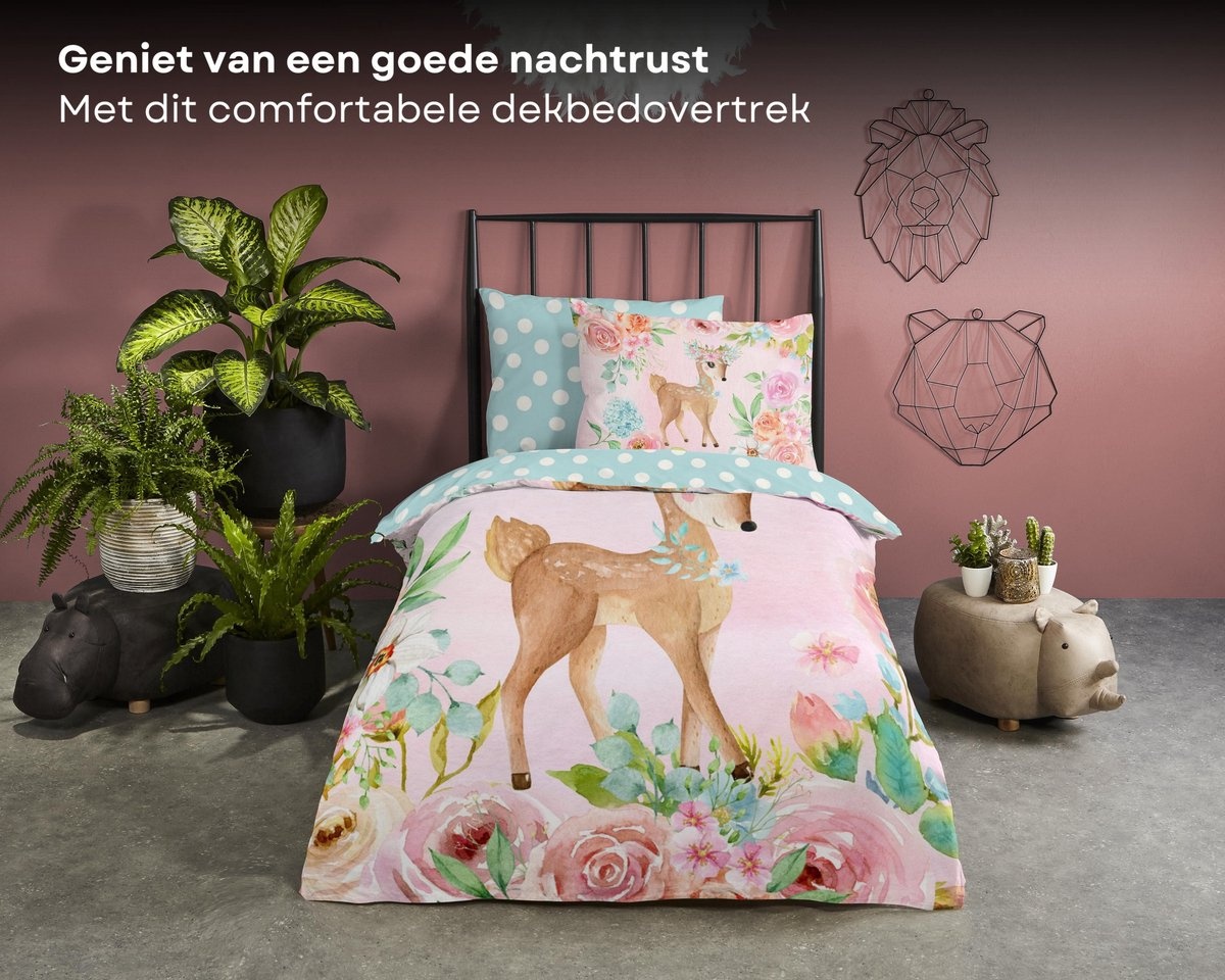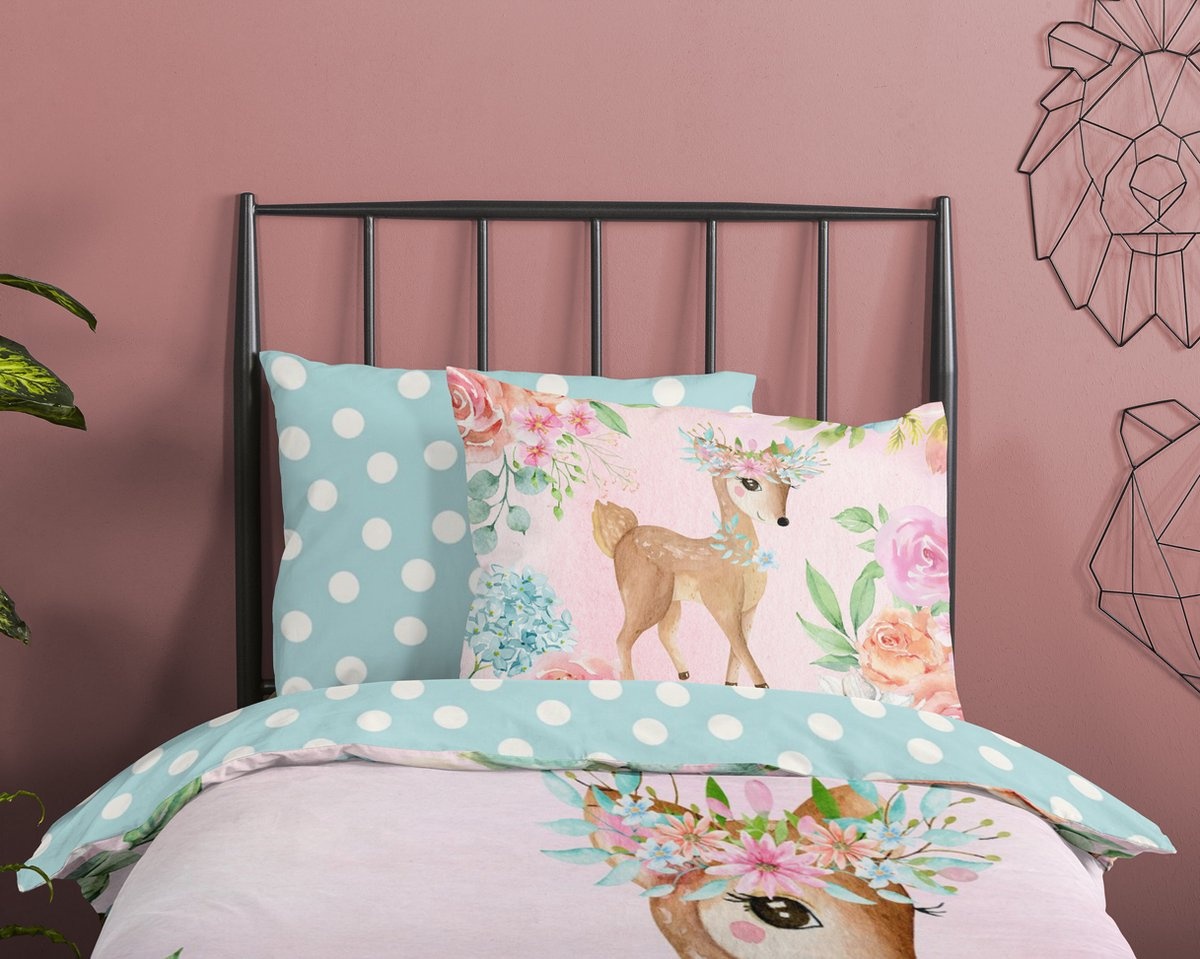 Dit dekbedovertrek valt binnen onze categorie herten dekbedovertrekken en is ideaal voor een romantische of sprookjesachtige kinderkamer. De achterzijde met stippen in zachte tinten geeft het geheel een speels accent.