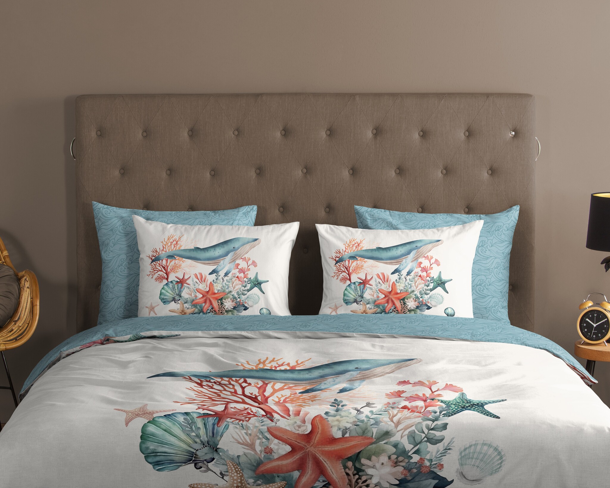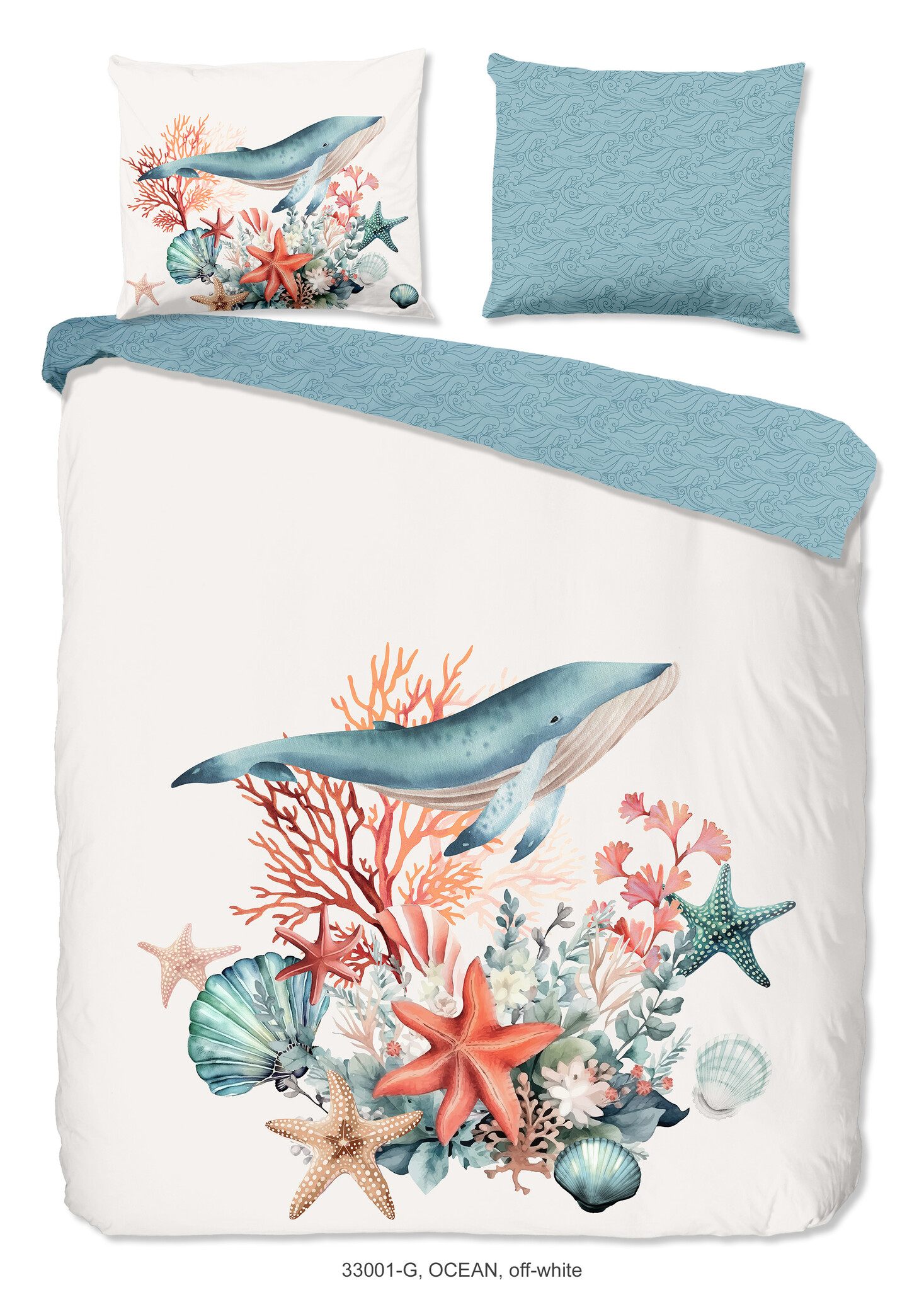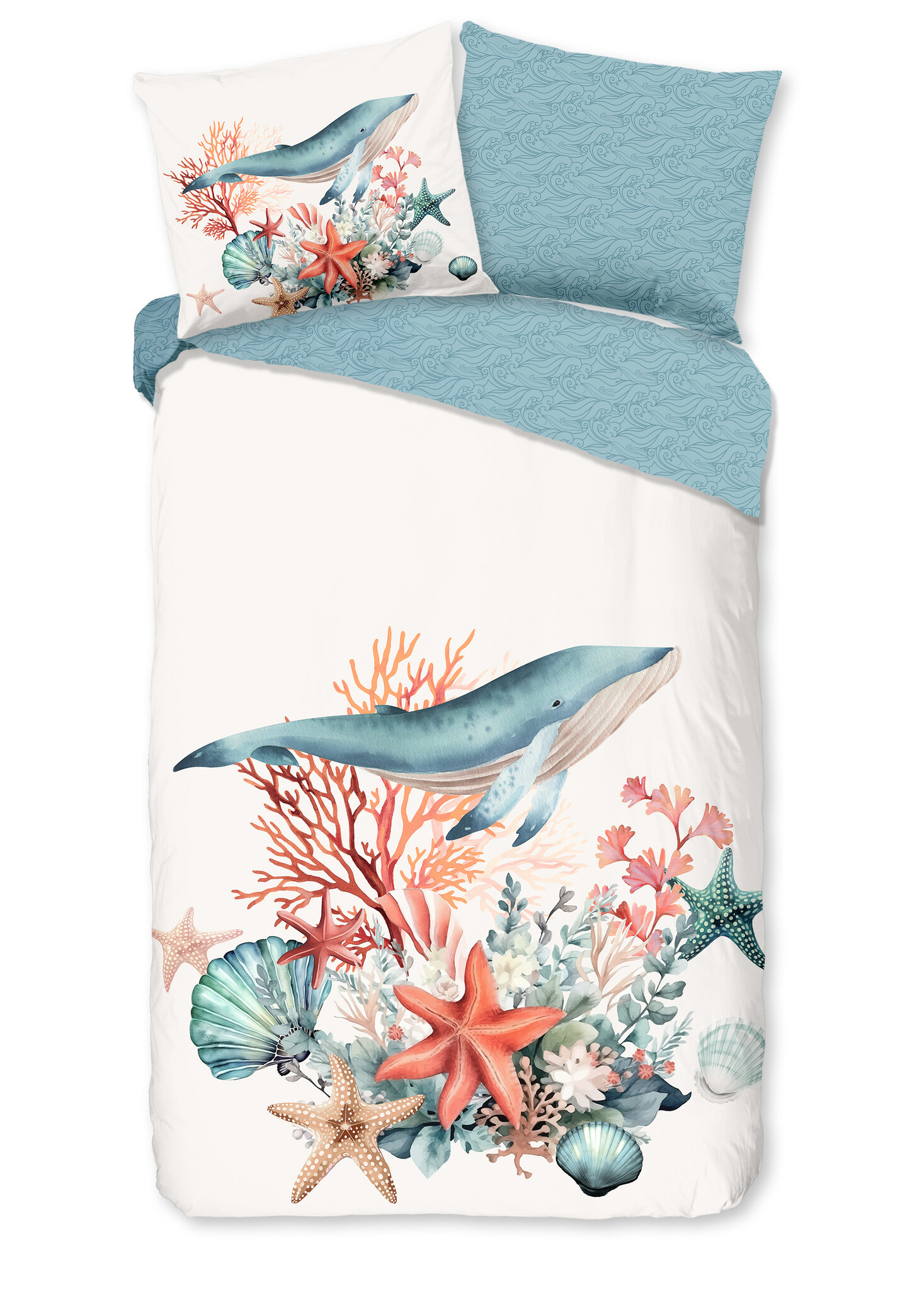Het Good Morning Ocean ecru dekbedovertrek neemt je mee naar een rustige onderwaterwereld met een sierlijke walvis, koraal, schelpen en zeesterren in zachte blauw- en koraaltinten. Het speelse maar rustige ontwerp zorgt voor een frisse, maritieme sfeer in de slaapkamer. Ocean ecru past perfect binnen de strand dekbedovertrekken categorie.
