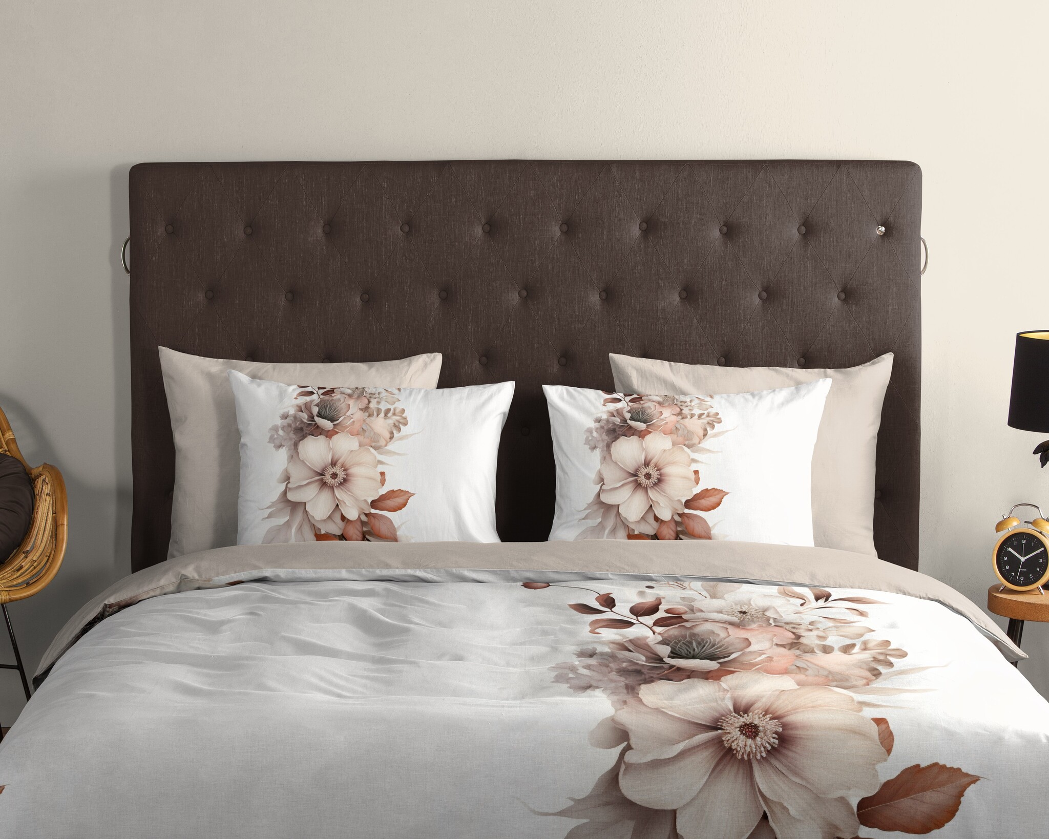 Ja, de ecrukleur en zachte bloemen sluiten perfect aan bij een neutrale slaapkamer.