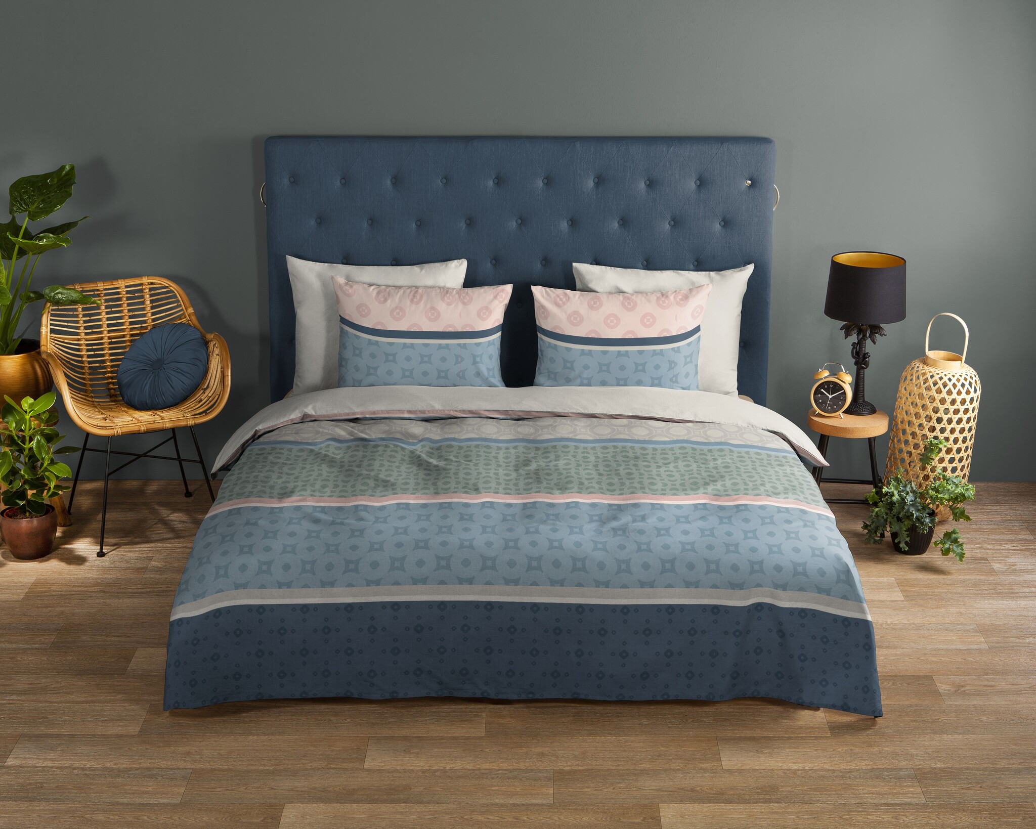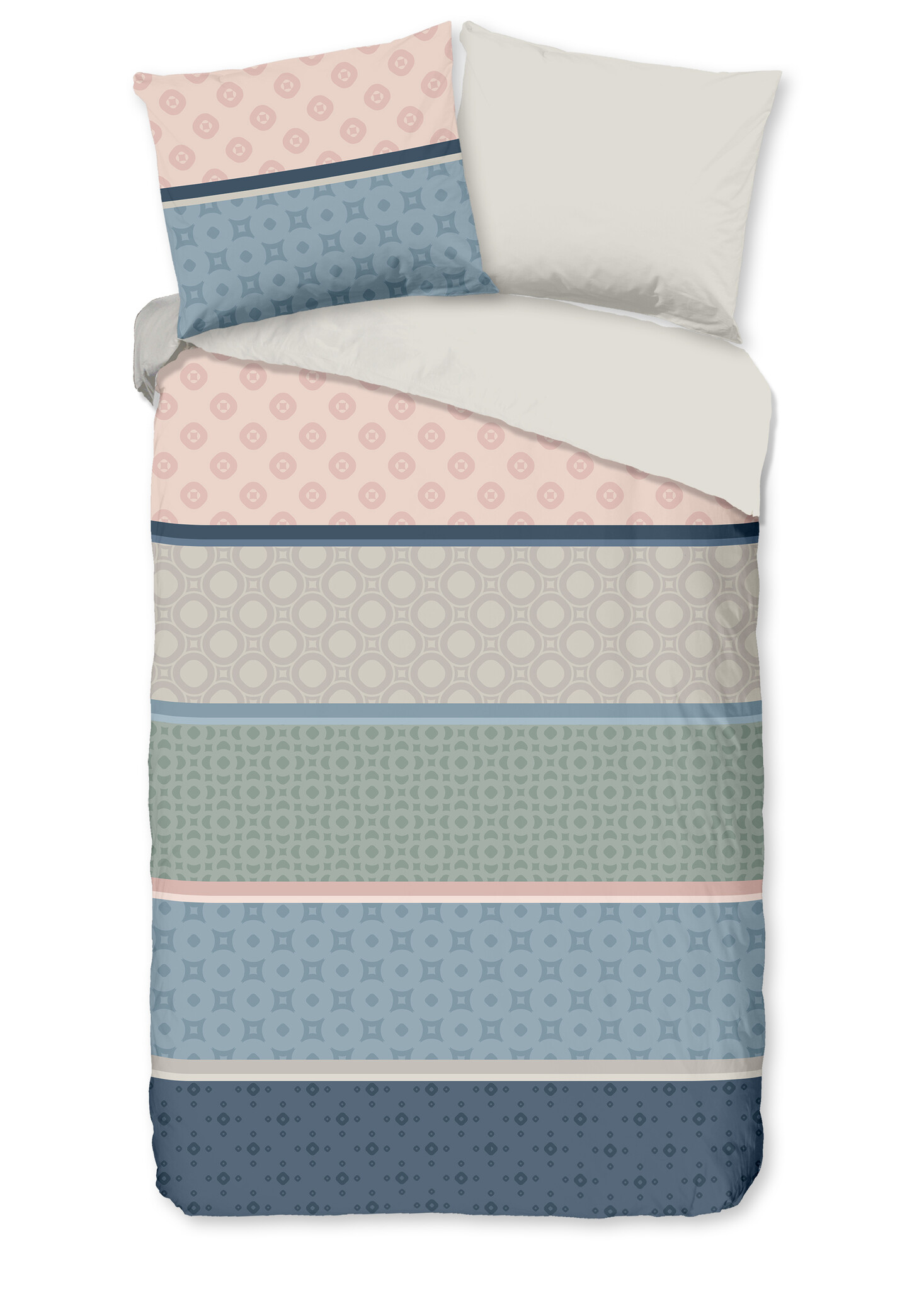 Het Good Morning Vida multi dekbedovertrek heeft een modern streepdessin met subtiele grafische patronen in zachte tinten zoals blauw, groen, zand en lichtroze. De horizontale banen geven rust, terwijl de verschillende motieven zorgen voor een speels effect. Vida multi past perfect binnen de strepen dekbedovertrekken categorie.