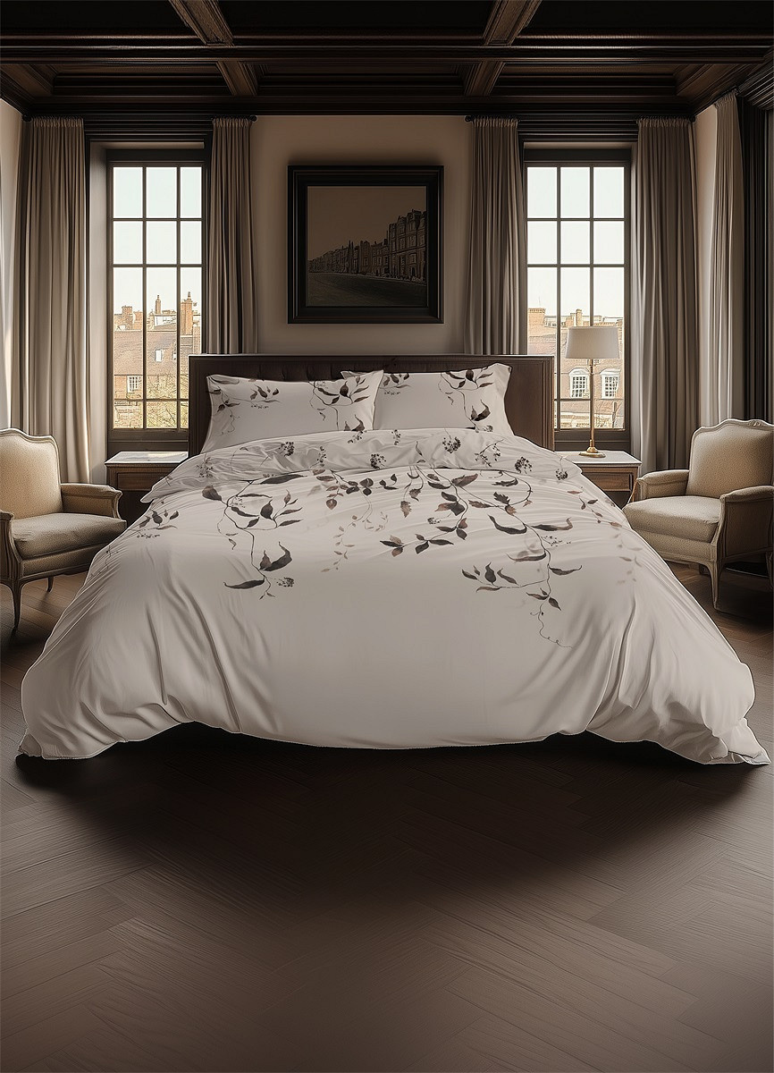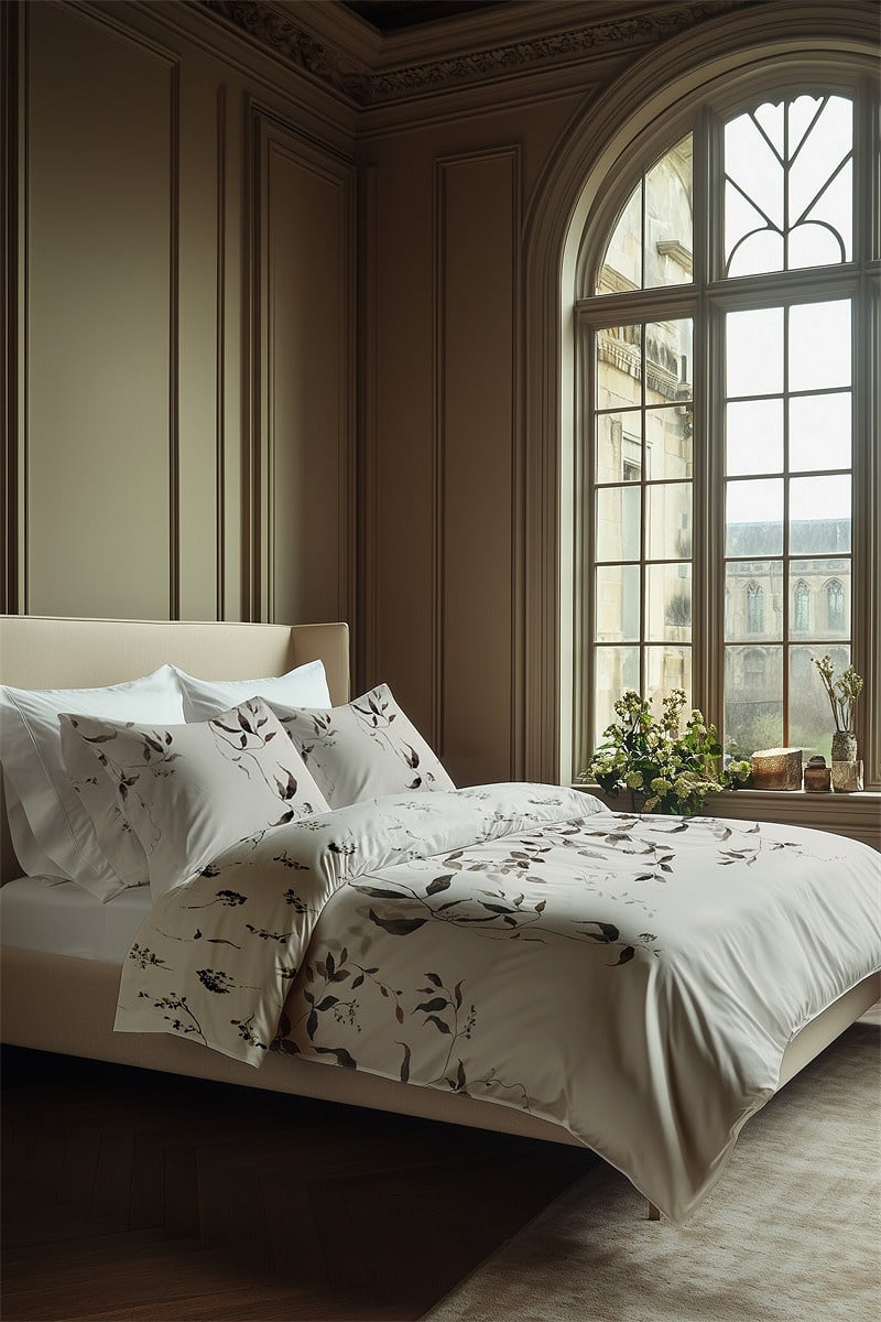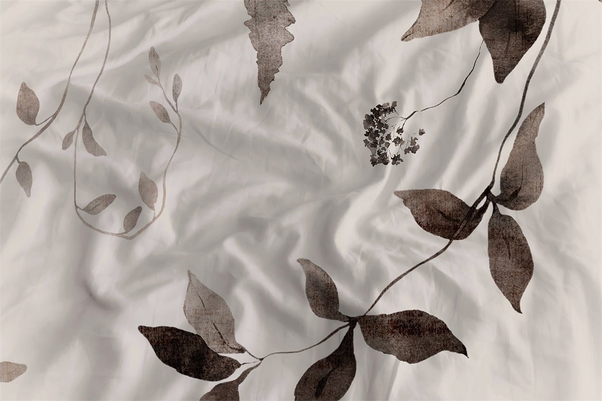 Het subtiele bladeren dessin in zandtinten geeft de slaapkamer een rustige en luxe uitstraling.