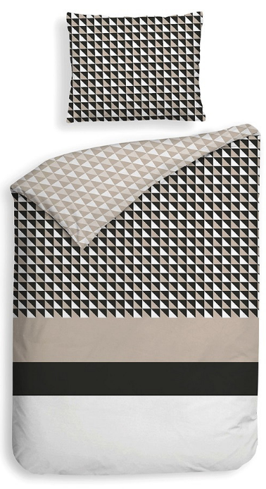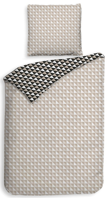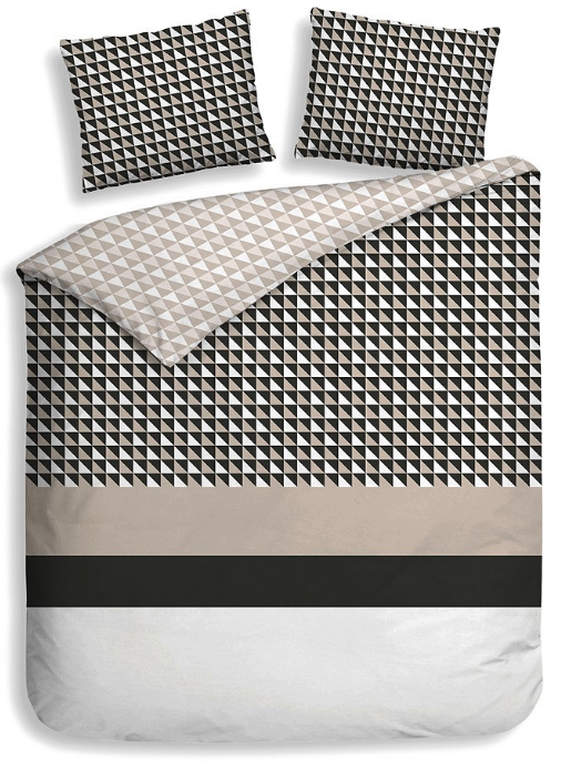 Het Heckett & Lane Carter Naturel dekbedovertrek heeft een strak en modern geometrisch dessin met kleine driehoekige patronen in zwart, beige en natuurlijke tinten. De subtiele kleurovergangen en het grafische lijnenspel geven het geheel een eigentijdse en luxe uitstraling die perfect past in een moderne slaapkamer.