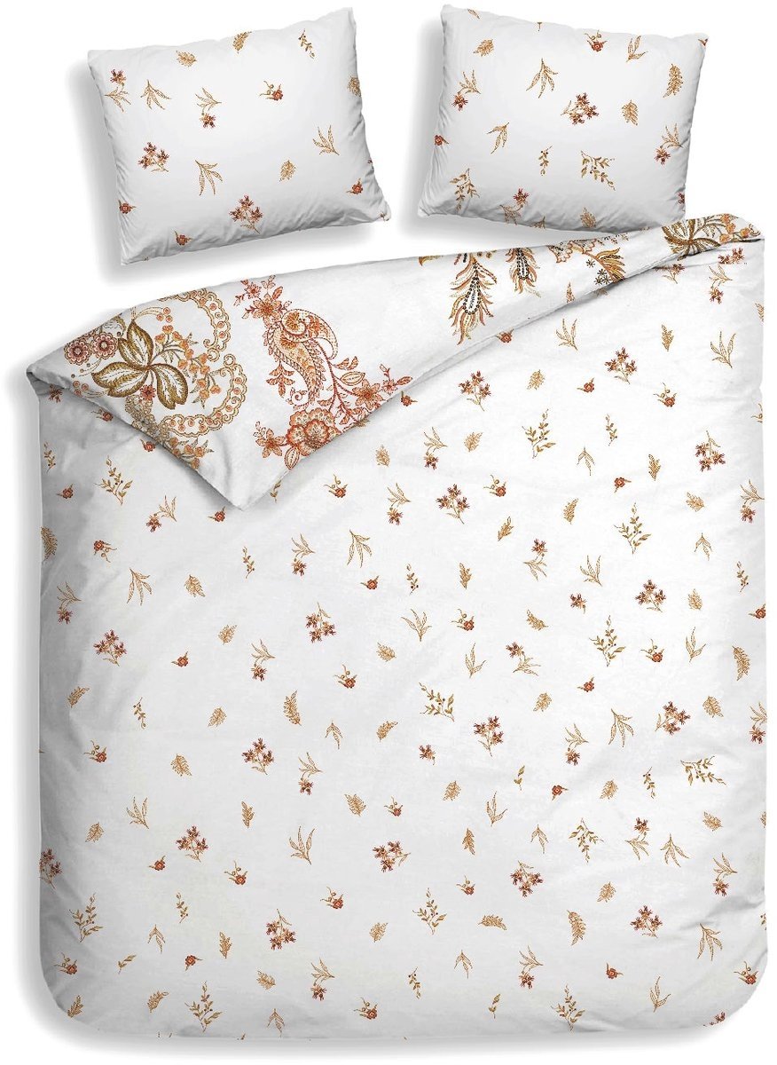 Het Heckett & Lane Ceyda Wit dekbedovertrek combineert een verfijnd bloemen- en paisleypatroon met warme oranje en goudachtige accenten op een lichte ondergrond. Het sierlijke ontwerp zorgt voor een elegante en romantische sfeer die perfect aansluit bij een stijlvolle en warme slaapkamerinrichting.