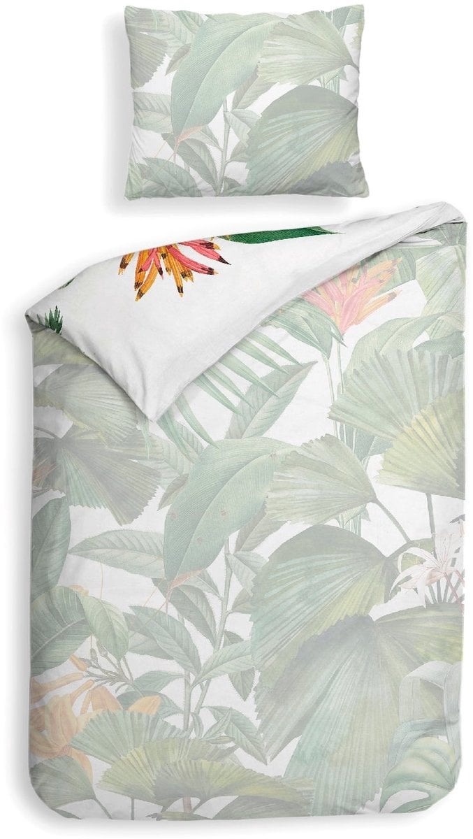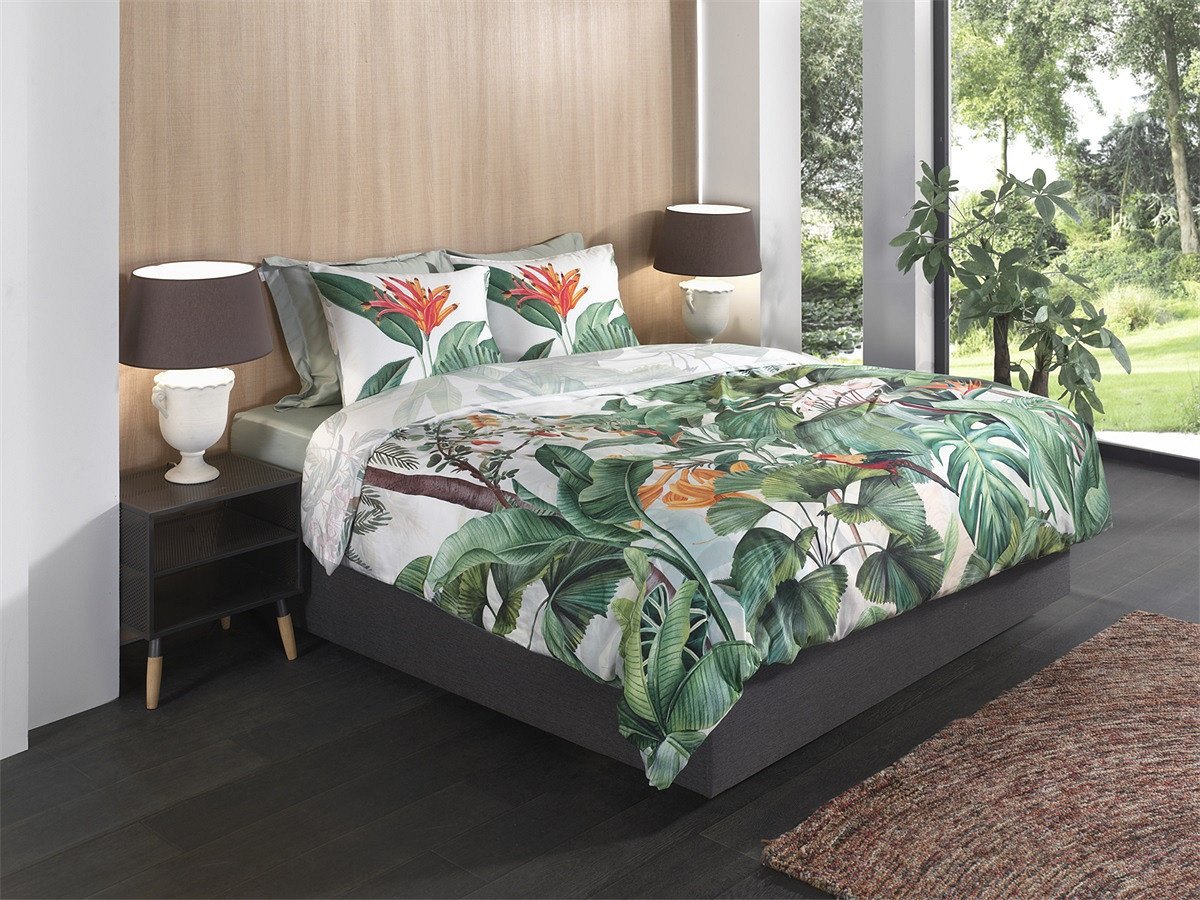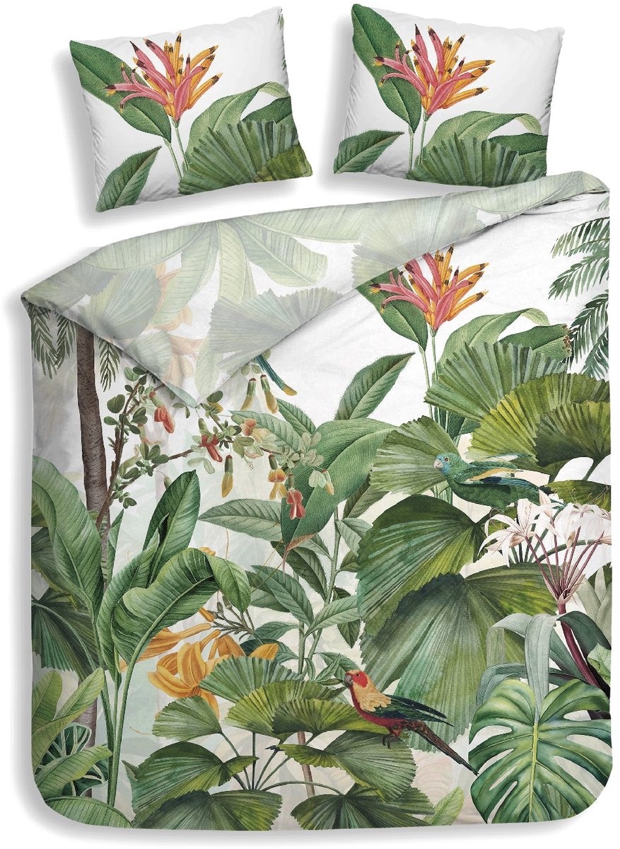 Dit verfijnde dekbedovertrek straalt een serene en luxe sfeer uit dankzij het rijke botanische ontwerp met exotische bladeren, bloemen en kleurrijke vogels op een frisse witte ondergrond. Het levendige junglepatroon geeft de slaapkamer direct een stijlvolle en natuurlijke uitstraling die perfect past binnen een modern en rustgevend interieur.