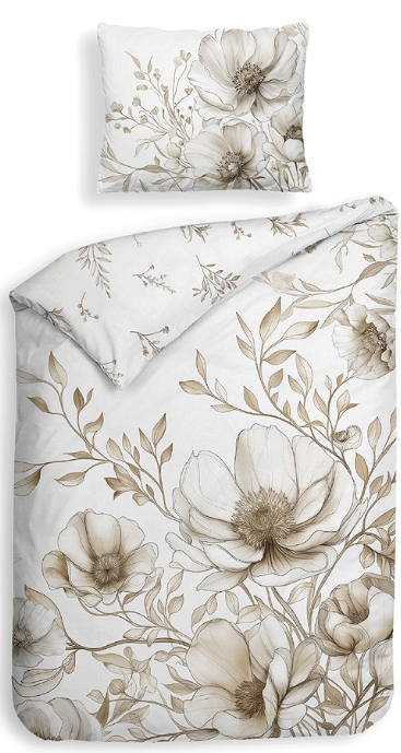Het Heckett & Lane Giotto Creme dekbedovertrek heeft een verfijnd en romantisch bloemen dessin in warme crème- en beigetinten. De grote, sierlijke bloemen en subtiele bladeren zorgen voor een rustige en luxe uitstraling die perfect aansluit bij een elegante slaapkamerinrichting.