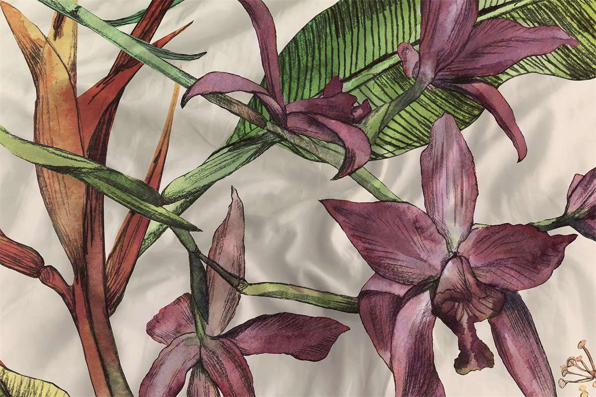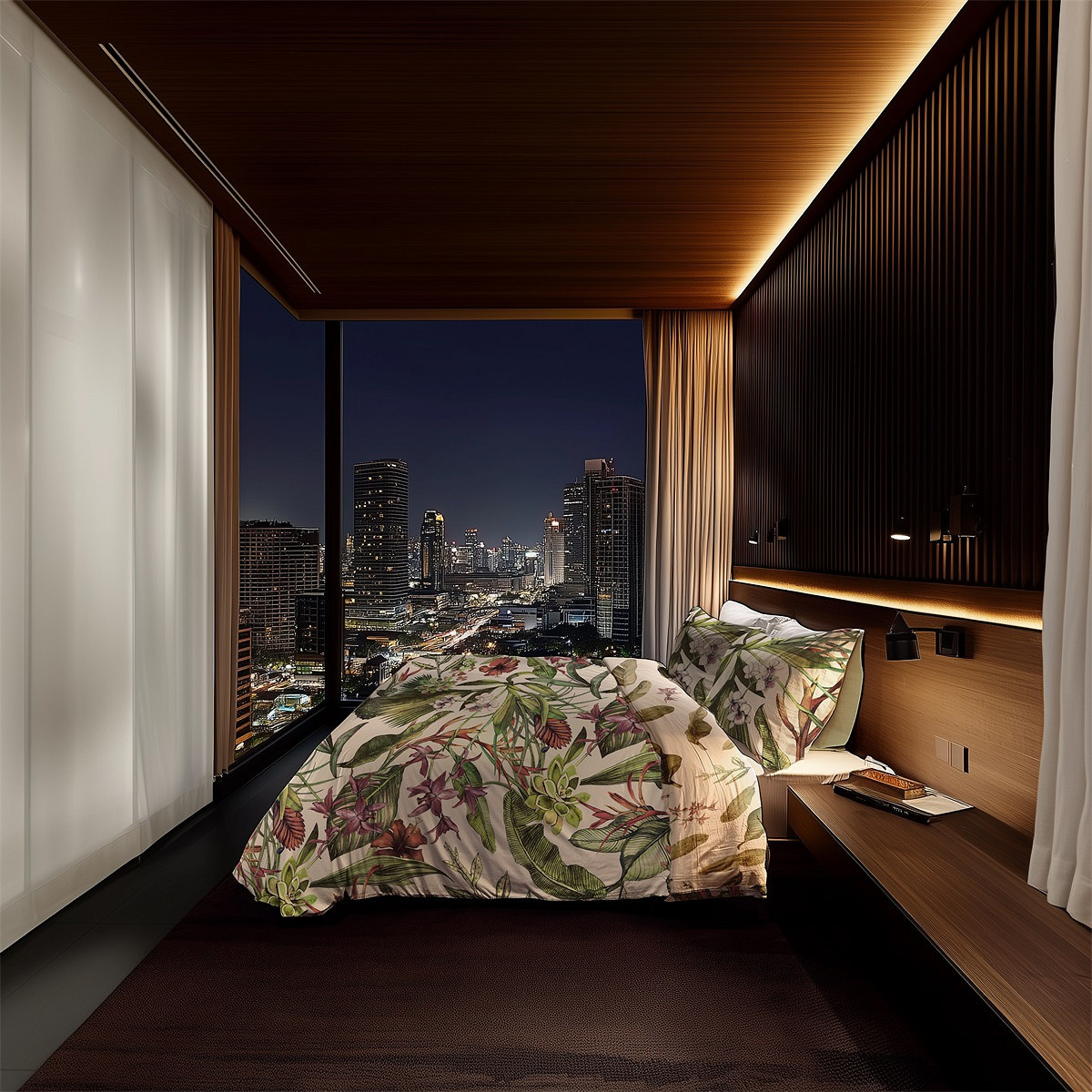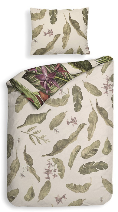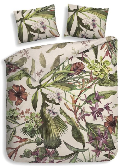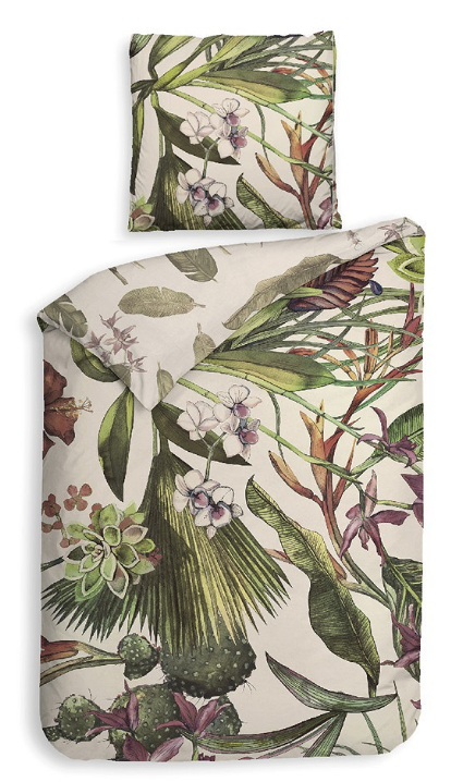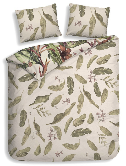 Het Heckett & Lane Jira Multi dekbedovertrek valt direct op door het weelderige botanische dessin met grote bladeren, bloemen en tropische accenten in natuurlijke groentinten en warme aardekleuren. De lichte achtergrond zorgt voor een rustige basis, terwijl het rijke patroon een levendige en stijlvolle uitstraling creëert in de slaapkamer.