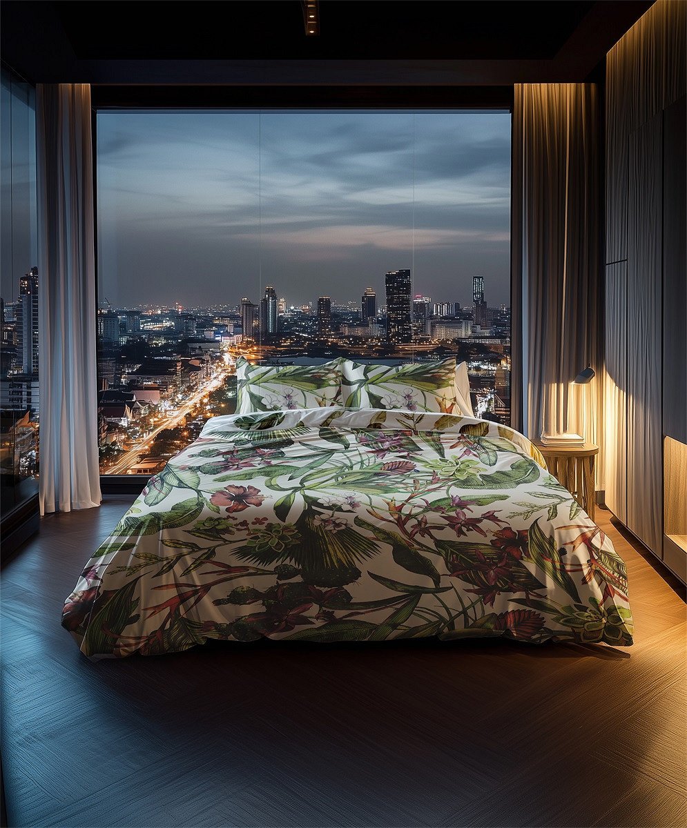 Het rijke botanische bladeren dessin geeft de slaapkamer een luxe, natuurlijke en sfeervolle uitstraling.