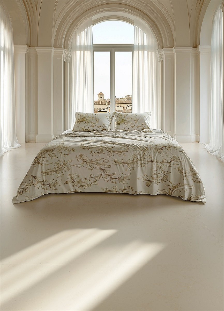 Het klassieke ornamenten dessin en de zachte beige tinten geven de slaapkamer een elegante en serene uitstraling.