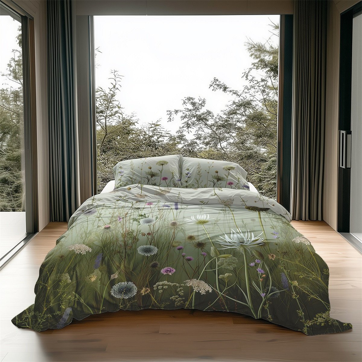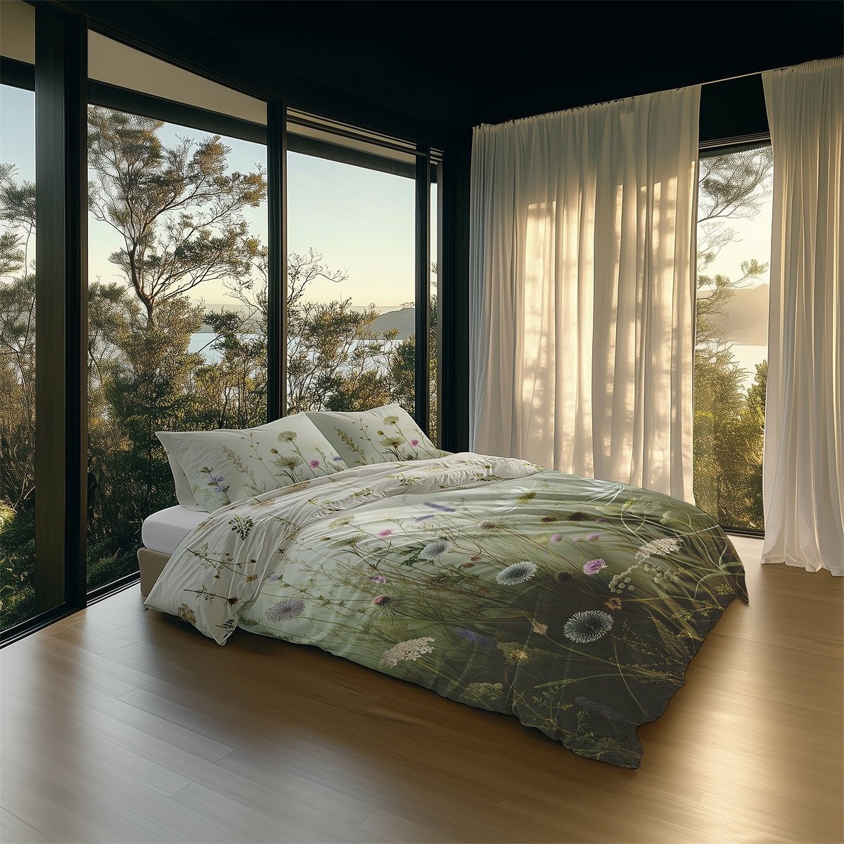 Het verfijnde wildbloemen dessin creëert een rustige, natuurlijke en elegante sfeer in de slaapkamer.