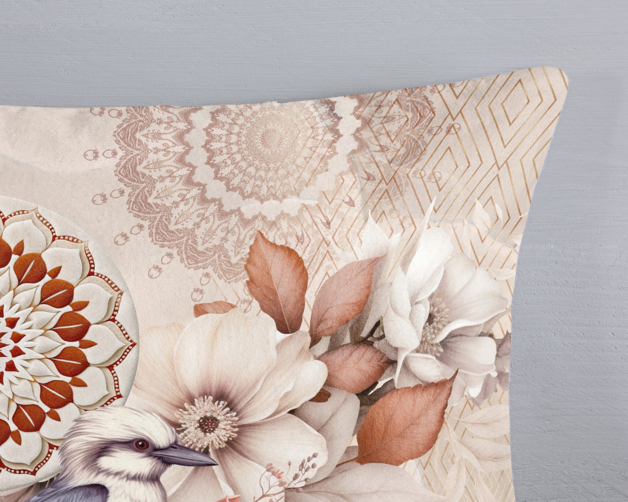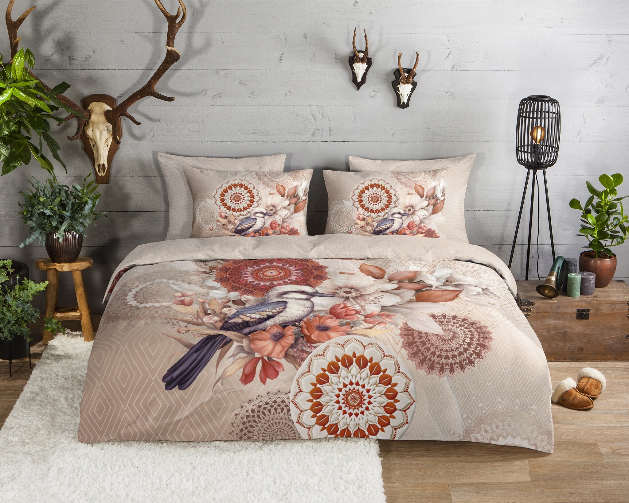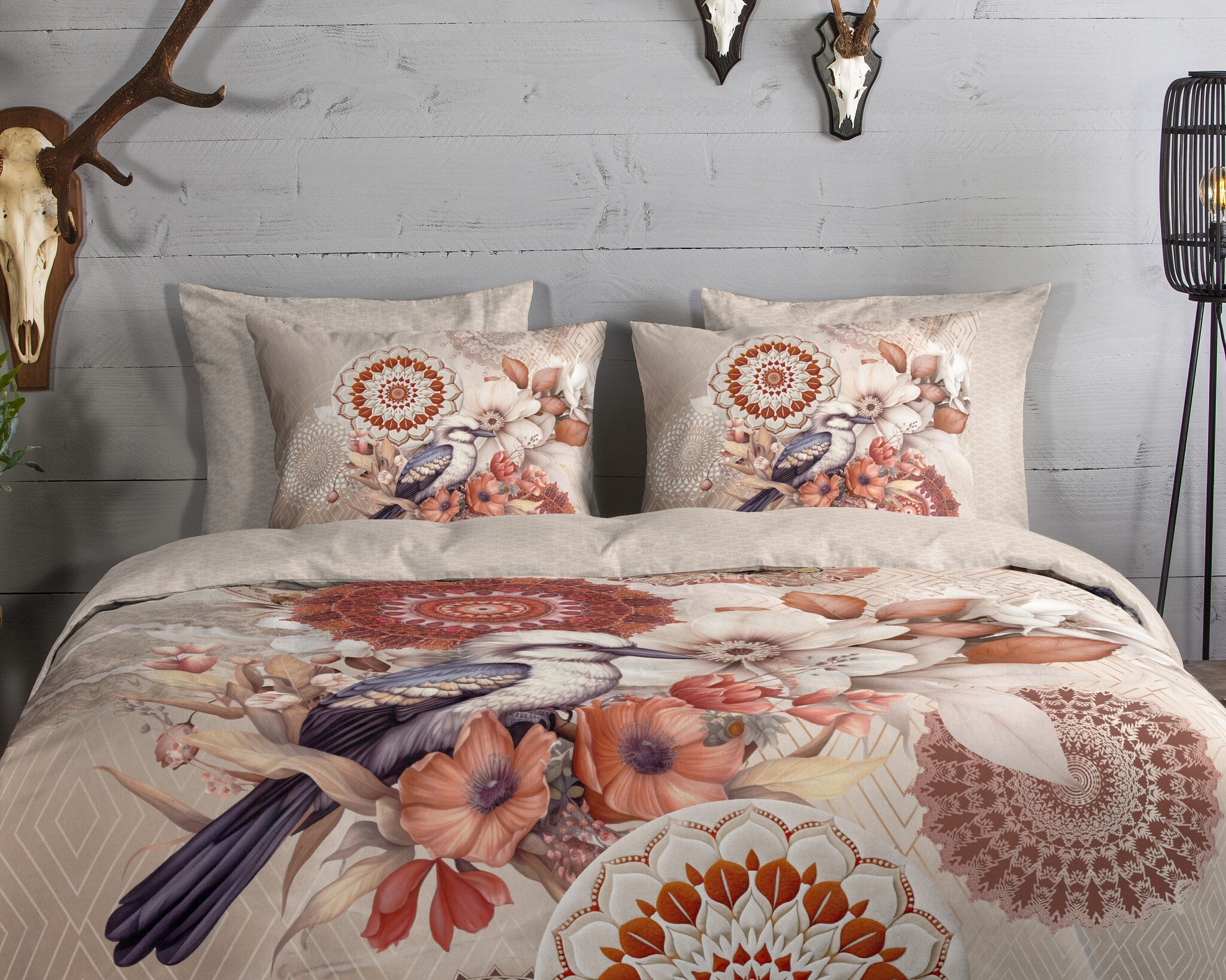 Het HIP dekbedovertrek Luigio Zand combineert een sierlijke vogel met verfijnde mandala-patronen en grote, zachte bloemen. De warme mix van zand, beige en terracotta geeft het ontwerp een rustige en elegante uitstraling die perfect aansluit bij een sfeervolle, natuurlijke slaapkamerstijl.
