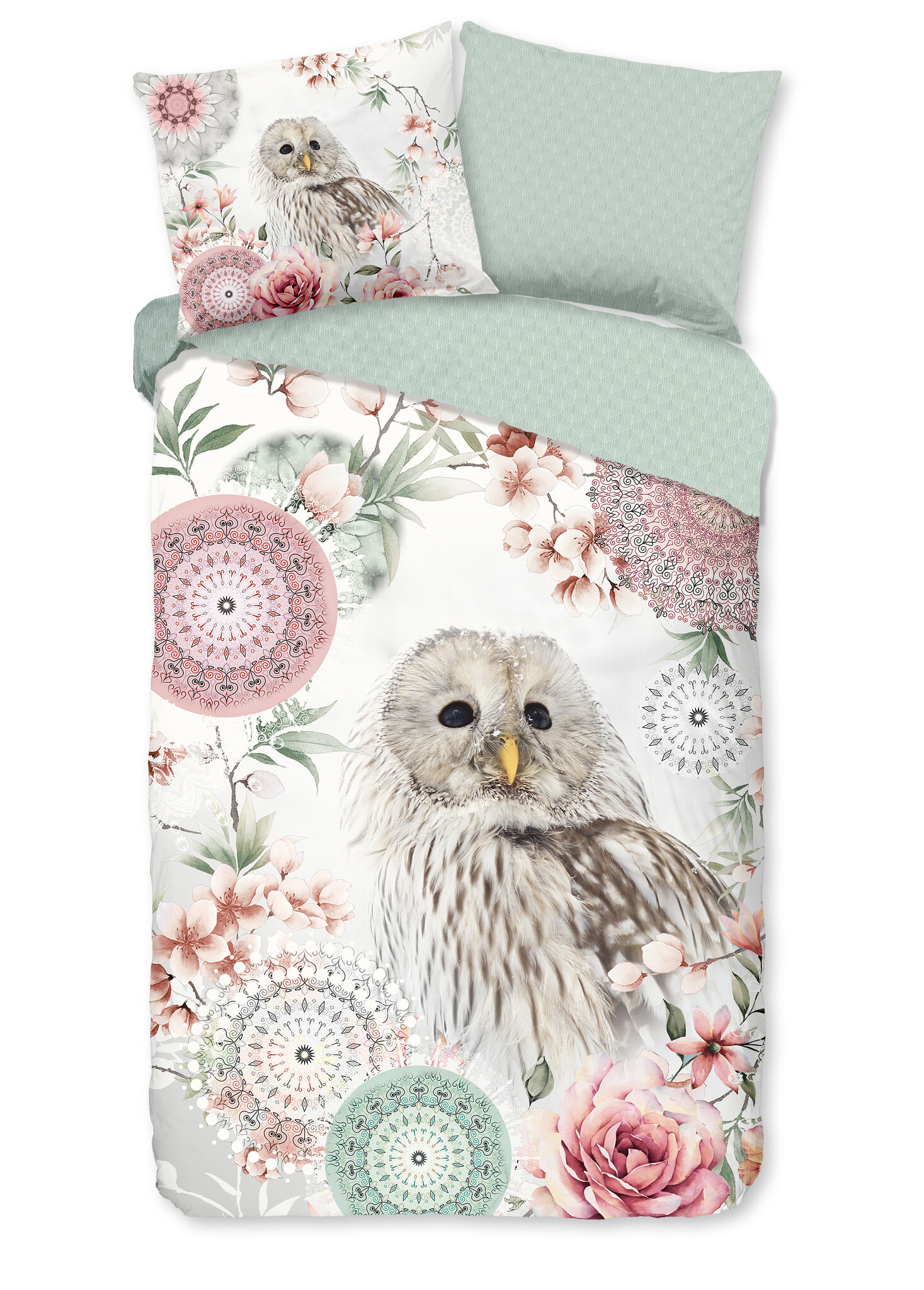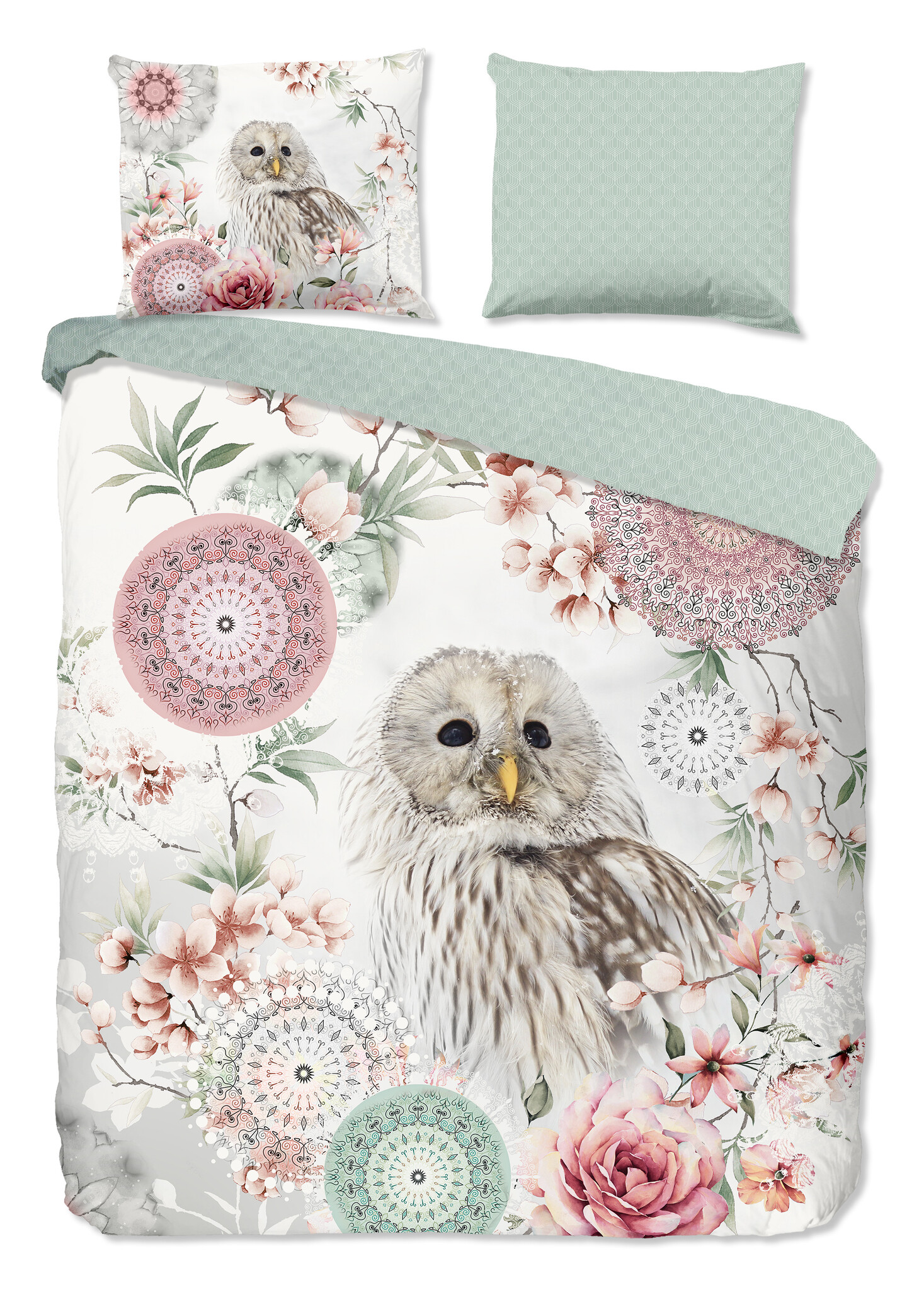 Het HIP Dekbedovertrek Omaira Ecru straalt rust en verfijning uit met een sierlijke uil tussen bloesemtakken en subtiele mandala-accenten. De zachte ecru ondergrond in combinatie met pastelroze en groentinten geeft het geheel een lichte en dromerige uitstraling.
