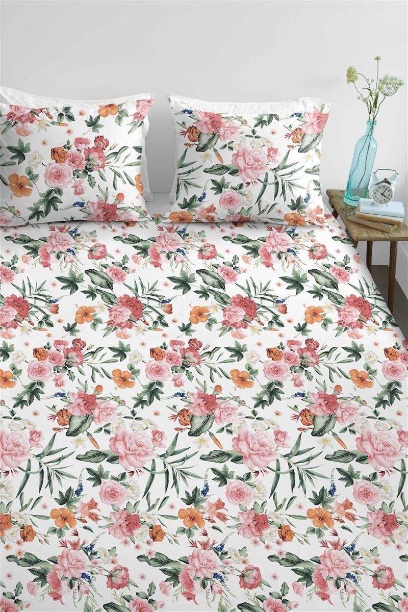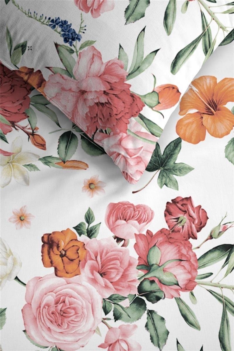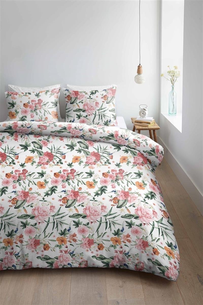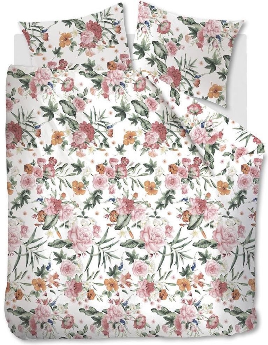 Het dekbedovertrek heeft een romantische uitstraling met een bloemen en bladeren dessin op een lichte achtergrond. Het is een fris overtrek met rozen, hibiscus bloemen en tropische bladeren. De kussenslopen hebben hetzelfde dessin. Perfect voor de romantische en of klassieke slaapkamer..