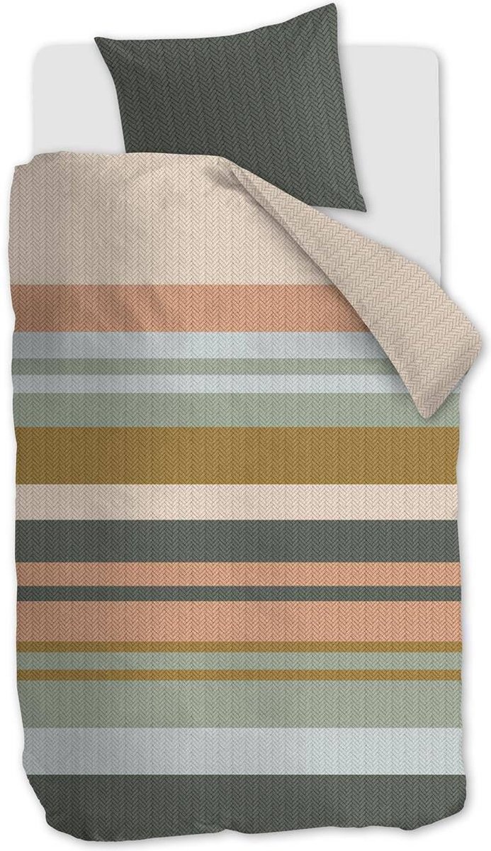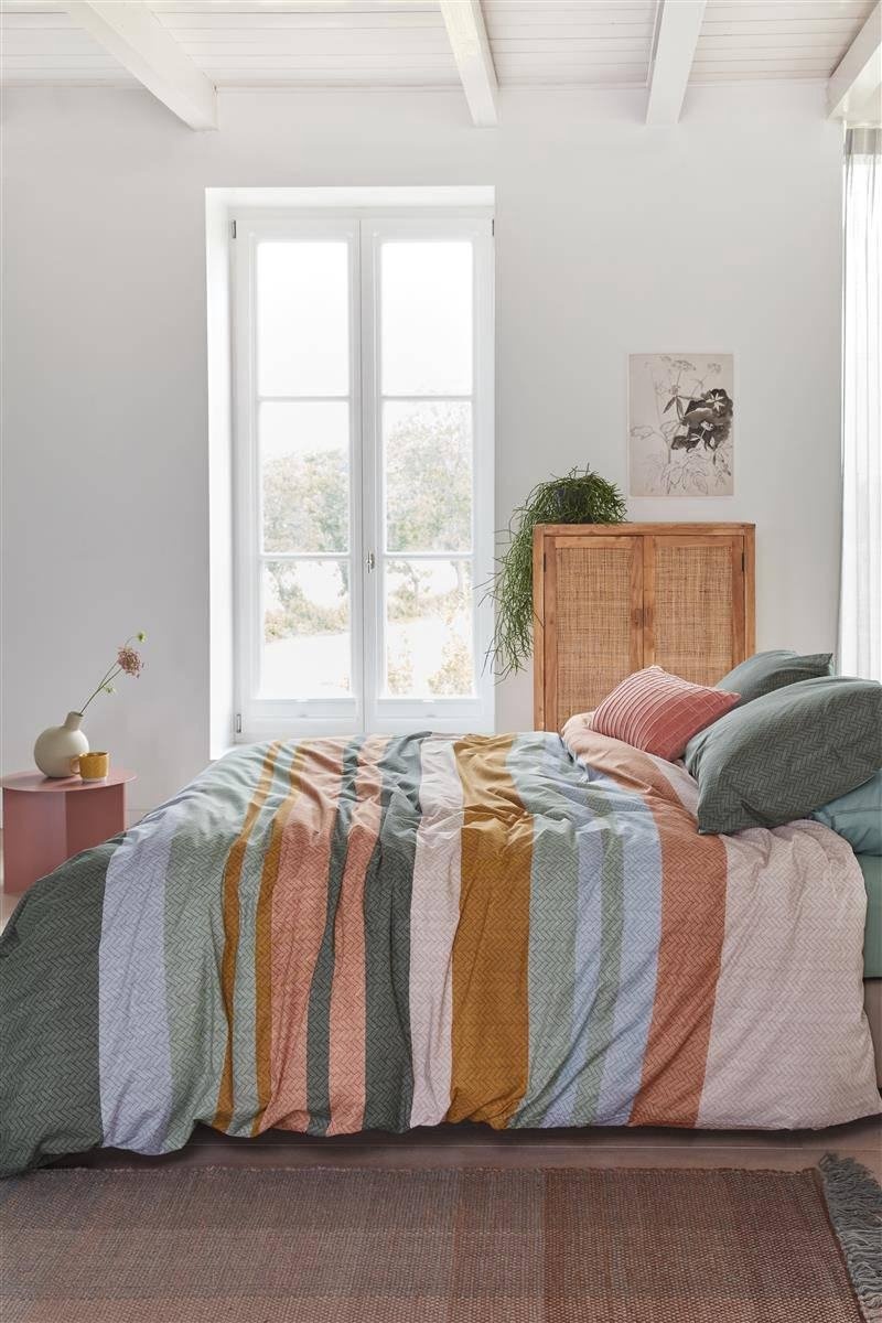 Dit prachtige dekbedovertrek creëert een aangename en fijne sfeer in je slaapkamer. Het dekbedovertrek is voorzien van meerdere gekleurde banen met een modern visgraat patroon. De banen in natureltinten worden afgewisseld door enkele banen met opvallendere kleuren. Dit overtrek is perfect voor een moderne, eigentijdse slaapkamer. Het dekbedovertrek maakt van je bed een echte eyecatcher!