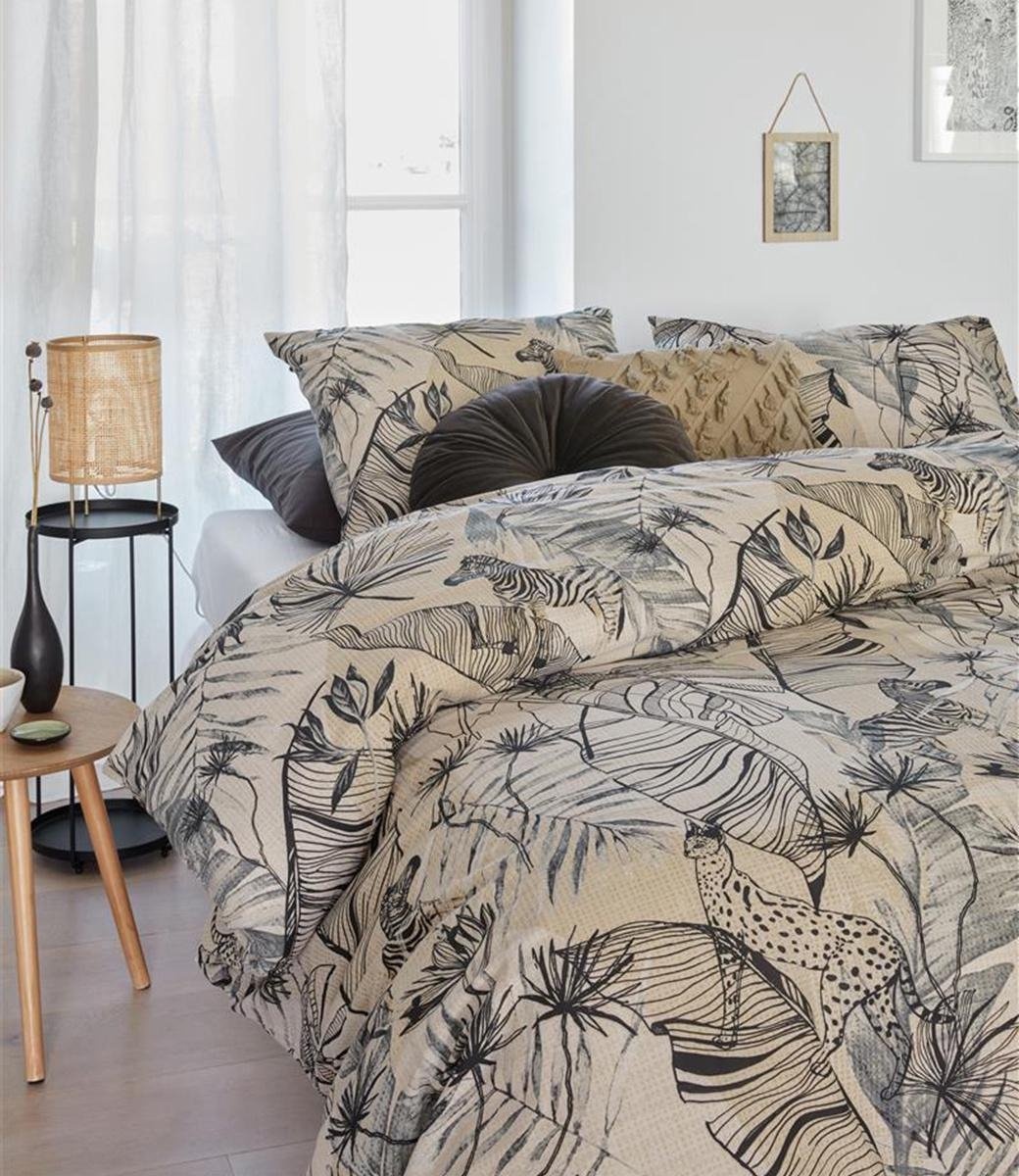 Helemaal van deze tijd is dit dekbedovertrek. Het moderne overtrek heeft een botanische uitstraling door de bladeren en exotische dieren. De natuurlijke tinten van zand, bruin en grijs zorgen voor een rustieke uitstraling, terwijl de zwarte lijnen zorgen voor een moderne touch. Maak je bed het middelpunt van de slaapkamer!