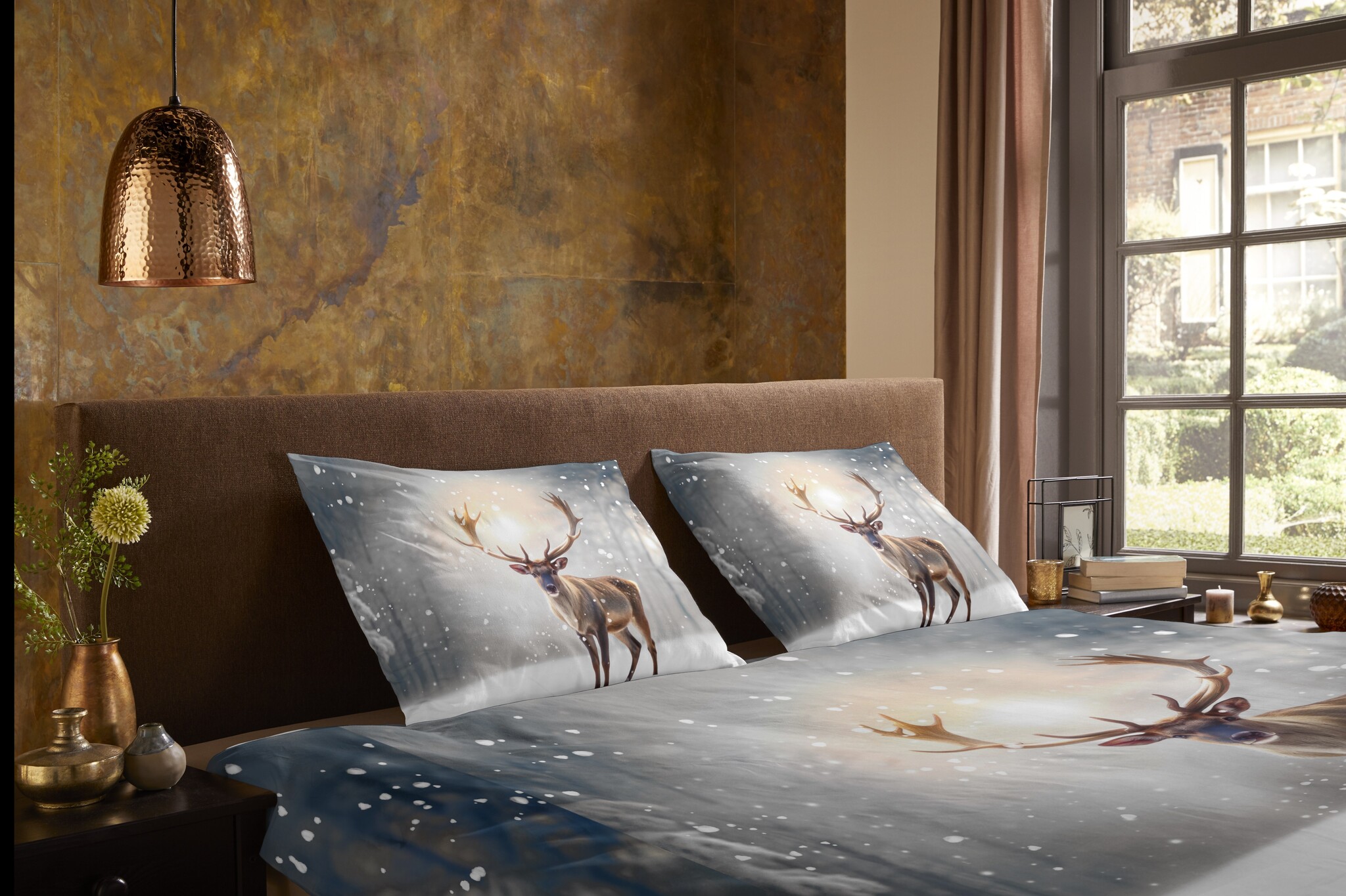 Het hert en het winterlandschap brengen kalmte in de slaapkamer.Comfort het hele jaar door