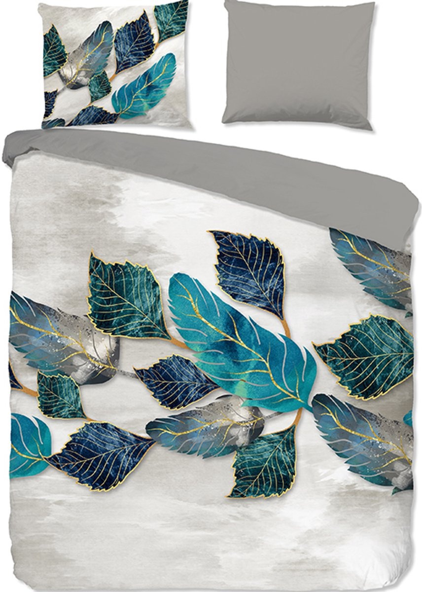 Het Pure Phuka Grijs dekbedovertrek combineert zachte grijstinten met verfijnde petrolkleurige bladeren en subtiele goudaccenten. Het moderne en artistieke design geeft je slaapkamer een frisse, eigentijdse uitstraling met een luxe touch.