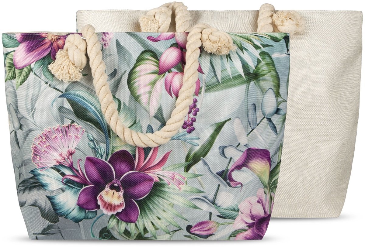 Deze strandtas is van de buitenkant gemaakt van 100% linnen, waardoor de tas een luxe uitstraling heeft. De strandtas heeft prachtige kleuren en is een ware blikvanger. De tas heeft een handige rits, waardoor de spullen er niet zomaar uit de tas zullen vallen.